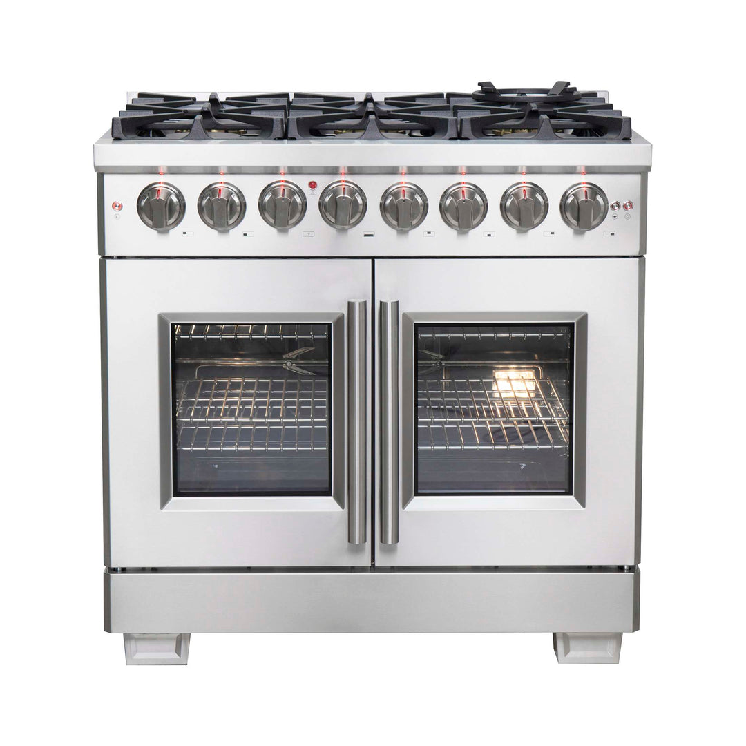 The Forno Capriasca 36-Inch french door dual fuel range harmonizes professional styling and performance into your home kitchen with its durable stainless-steel design. Unique french doors mean open doors allow up to 12 Inch of more space to access your oven. The gas rangetop has 6 sealed dual-ring brass burners with a total output of 120,000 BTU for simmering melting chocolate or simmering sauces. The heavy-duty continuous cast iron grates allow maximum stability of cookware and mobility over a recessed enamel Cooking Surface cavity which keeps spills and splashes contained and easy to clean. The 5.36 cu. ft. true convection oven with a total output of 6,300 Watts is encased in a speckled blue enamel interior, ensures fast, precise and consistent cooking along for easy viewing is a 3-layer glass oven door window. Included is an LP conversion kit, 3 stainless steel telescopic oven racks, wok support, reversible griddle, rotisserie kit and skewers forks, air fry basket with rack and drip pan. Additionally, zinc coated metal knobs with bezel rings will maintain their beauty for years.