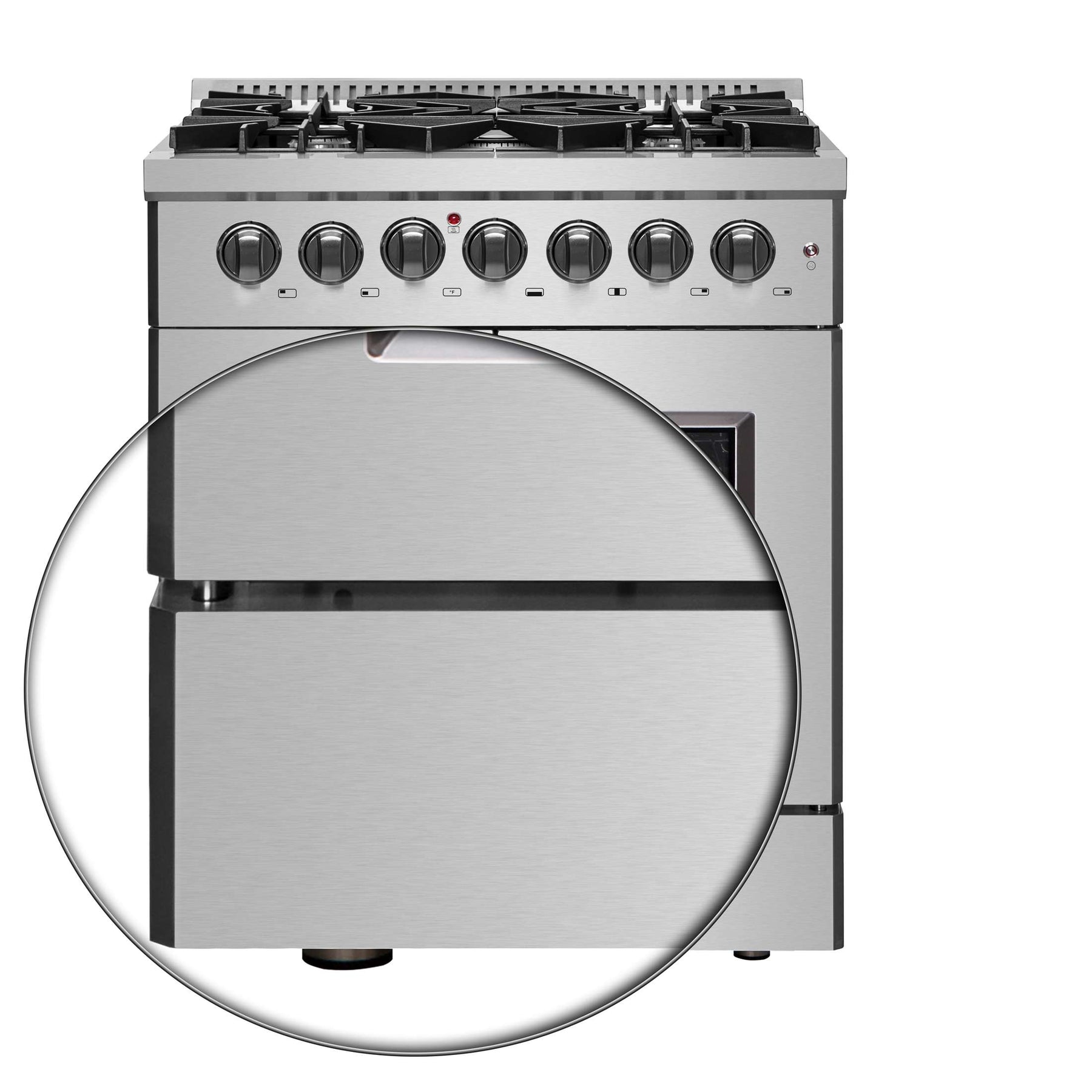 * Sleek stainless-steel design with pro-style handle and durable zinc-coated knobs for a premium look.