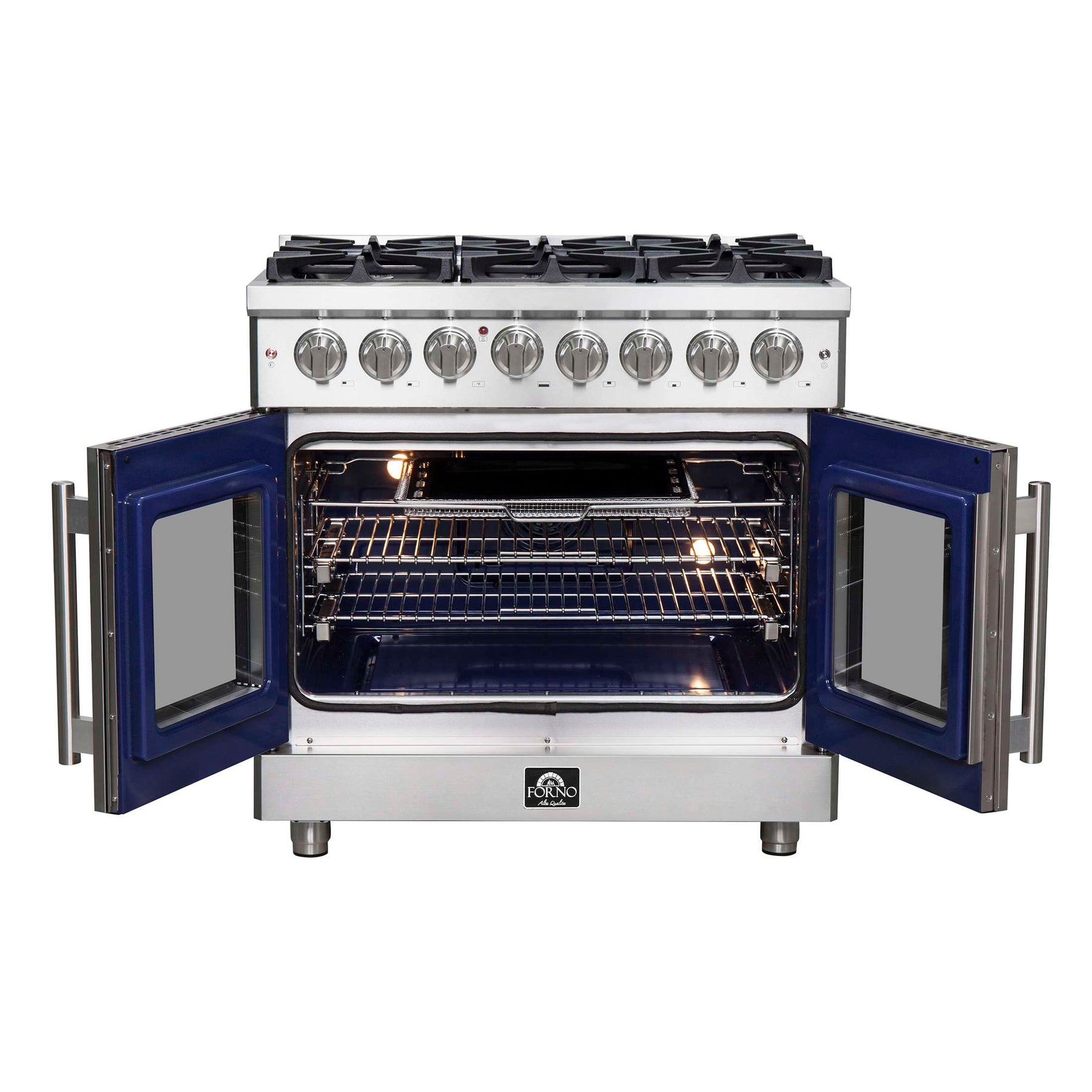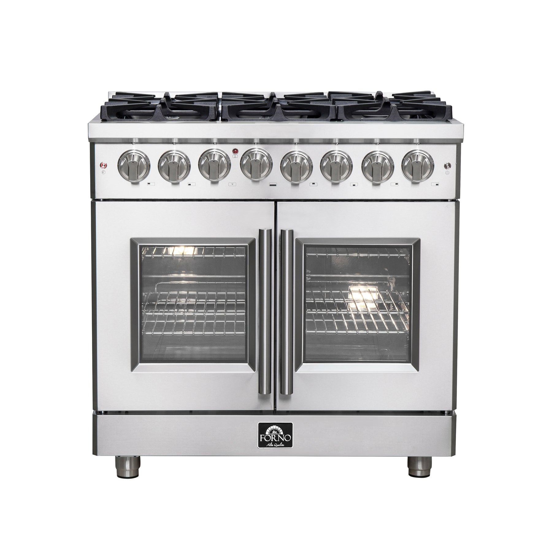 The Forno Massimo 36-Inch French Door Dual Fuel Range, harmonize professional styling and performance in a sleek stainless-steel design. The unique French doors offer convenient access, providing up to 12 inches of extra space around the oven. Featuring a powerful 20,000 BTU dual-ring brass burner, this range excels in tasks from boiling to searing, with precise simmering capabilities for delicate tasks like melting chocolate or simmering sauces. The heavy-duty continuous cast iron grates ensure stability for your cookware, while the recessed enamel cooking surface contains spills for easy cleanup. The 5.36 cu.ft. true convection fan oven boasts a blue enamel interior, simplifying maintenance while delivering a powerful 6,300 Watts output for impeccable baking, roasting, and broiling results. The 3-layer glass oven doors window retains heat and provides a clear view of your culinary creations. Included with the range are 2 telescopic oven racks, wok support, griddle, air-fryer kit with drip pan, a NEMA 14-50P power cord, and an LP conversion kit for added versatility. Plus, the zinc-coated metal knobs with bezel rings ensure lasting beauty for years to come, completing the sophisticated look of your kitchen space.