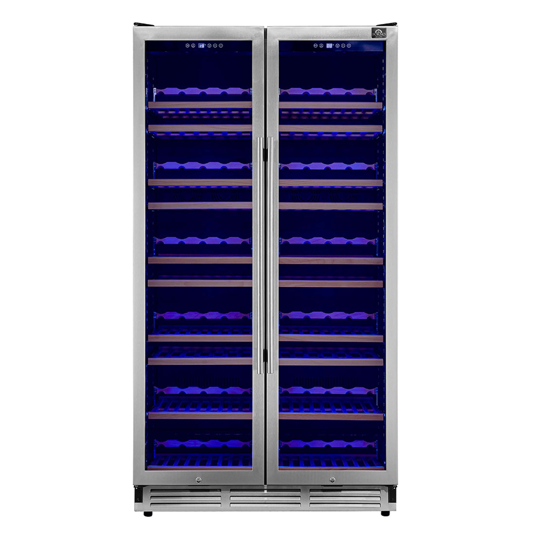 Elevate your wine collection with the Forno Vernazza 40" Dual Zone Wine Cellar, designed for optimal storage and elegance. With dual temperature zones, it preserves both red and white wines at ideal conditions. The stainless steel door frame and triple-layer UV-protected glass shield your collection from light exposure and condensation, maintaining flavor integrity. Inside, adjustable sliding and display shelves offer flexible storage, illuminated by soft LED lighting for a sophisticated presentation. The touchscreen control panel ensures precise temperature adjustments, while the charcoal air filter eliminates unwanted odors. A high-efficiency compressor provides consistent cooling with minimal energy consumption. For added security, the lockable door keeps your collection safe. With a spacious 25.07 cu. ft. capacity, this large wine cellar holds up to 166 bottles, making it perfect for connoisseurs and collectors alike.