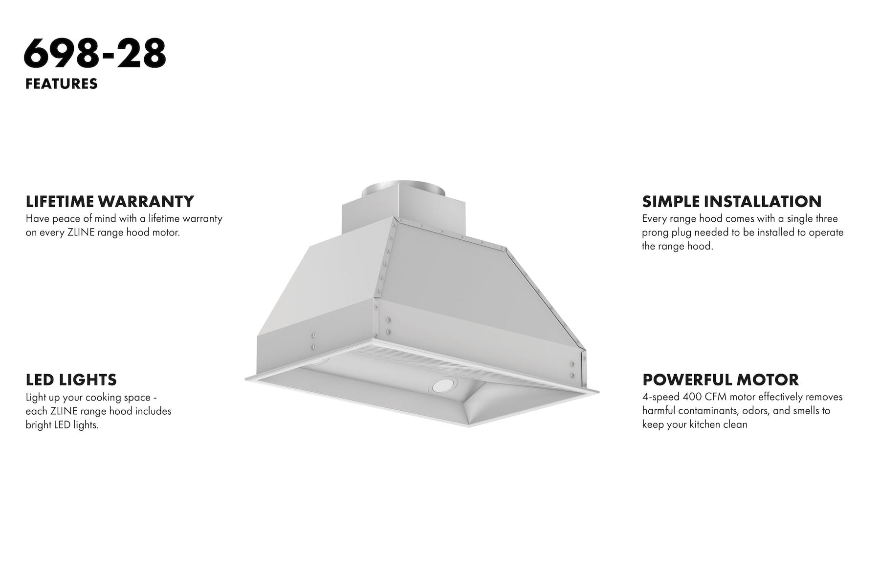 The ZLINE 698-28 is a 28-inch professional range hood insert designed to be both elegant and powerful, featuring the industry's only lifetime warranty motor. This hood is made from 430-grade stainless steel and is a ZLINE classic. Its durable construction, modern design, and lifetime warranty motor - a ZLINE exclusive - guarantee a range hood with a timeless design that will last a lifetime.