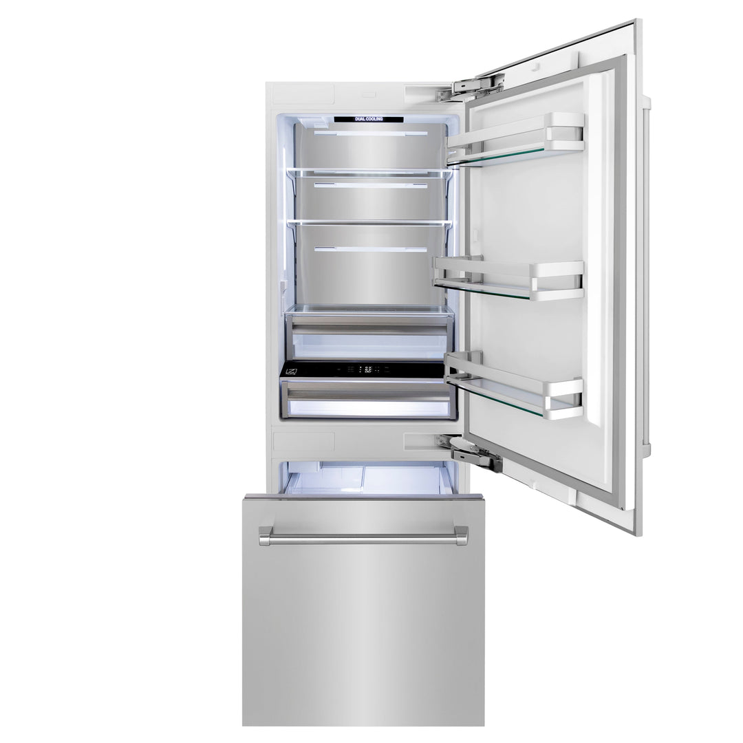 Enhance your kitchen with the ZLINE Professional 30" 16.1 cu. ft. Built-In 2-Door Bottom Freezer Refrigerator. This refrigerator combines high-quality performance with classic design, offering advanced capabilities such as adjustable temperatures, RapidChill Mode, and a concealed internal water and ice dispenser. Experience ZLINE's Attainable Luxury with this refrigerator, seamlessly blending innovation, elegance, and efficiency.