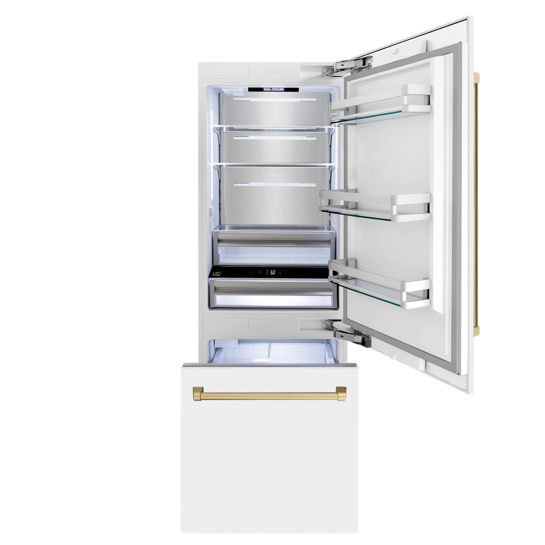 Enhance your kitchen with the ZLINE Autograph 30" 16.1 cu. ft. Built-In 2-Door Bottom Freezer Refrigerator. This refrigerator combines high-quality performance with classic design, offering advanced capabilities such as adjustable temperatures, RapidChill Mode, and a concealed internal water and ice dispenser. Experience ZLINE's Attainable Luxury with this refrigerator, seamlessly blending innovation, elegance, and efficiency.