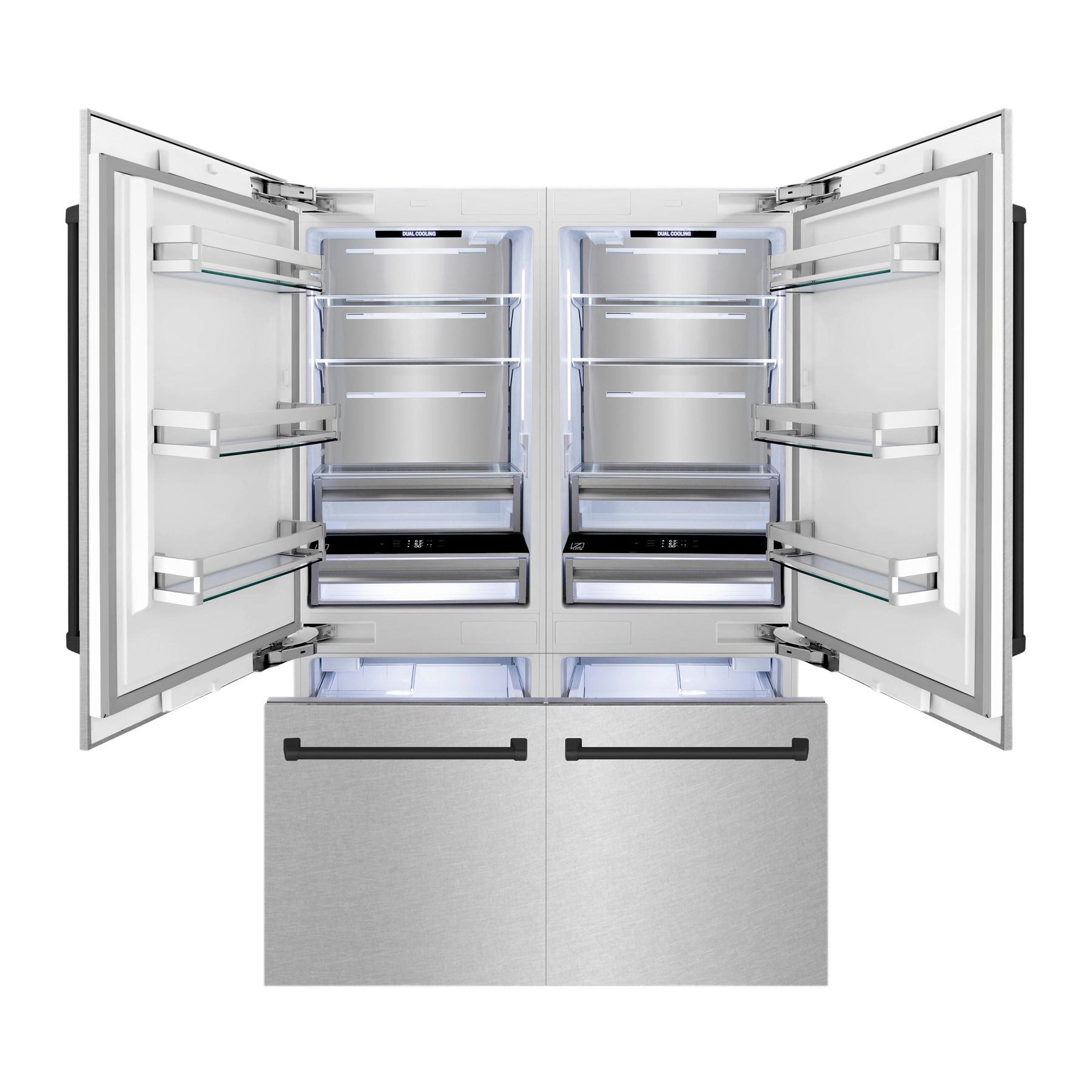 Enhance your kitchen with the ZLINE Autograph Durasnow 60" 32.2 cu. ft. Built-In 4-Door Bottom Freezer Refrigerator. This refrigerator combines high-quality performance with classic design, offering advanced capabilities such as adjustable temperatures, RapidChill Mode, and a concealed internal water and ice dispenser. Experience ZLINE's Attainable Luxury with this refrigerator, seamlessly blending innovation, elegance, and efficiency.