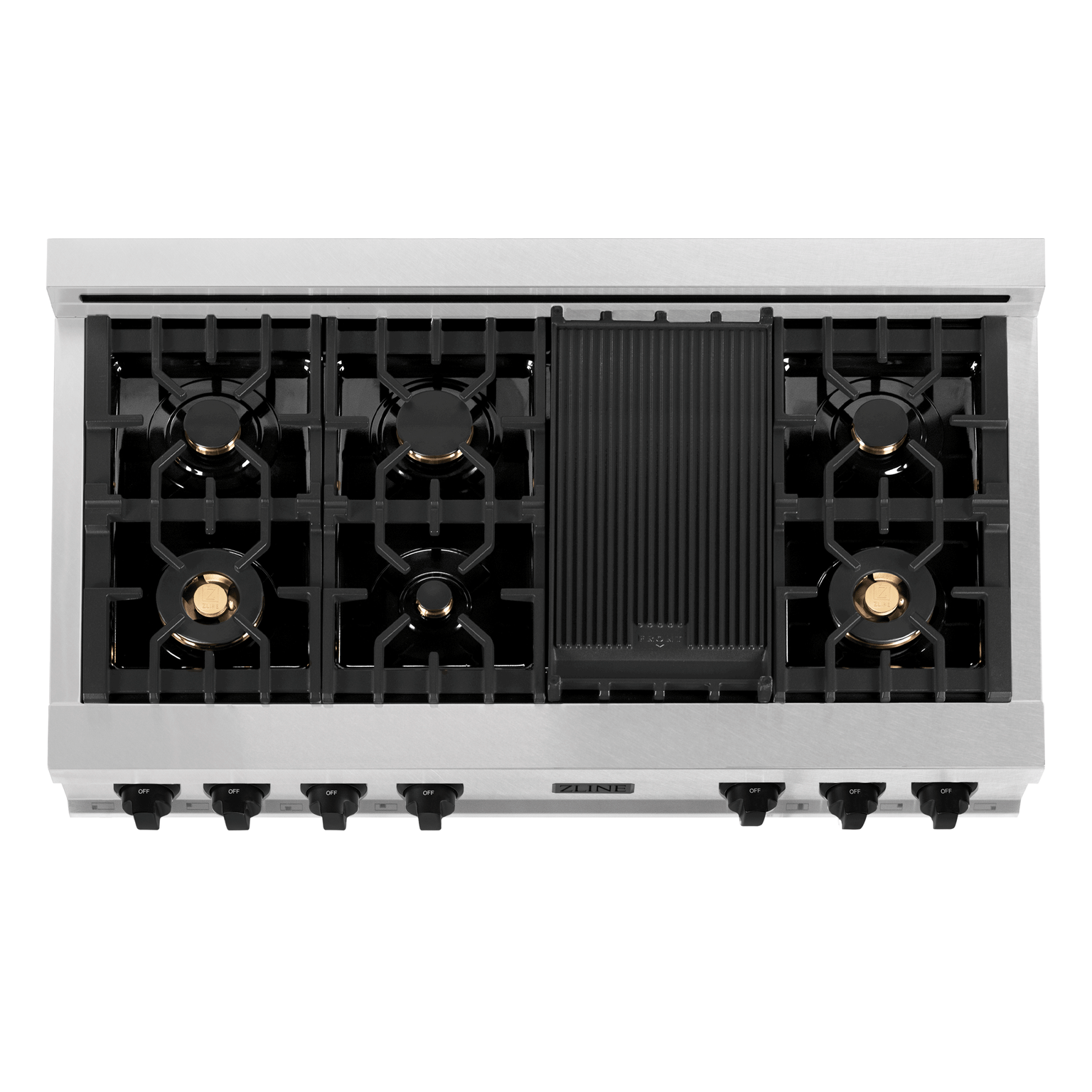 ZLINE Autograph Edition 48" Porcelain Rangetop with 7 Gas Burners in DuraSnow® Stainless Steel and Gold Accents, RTSZ-48-MB