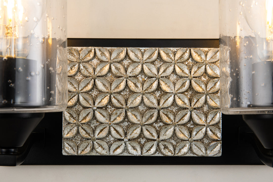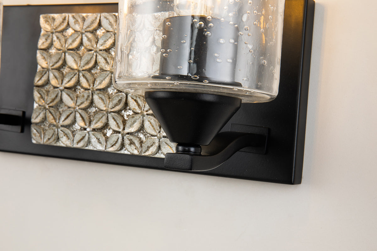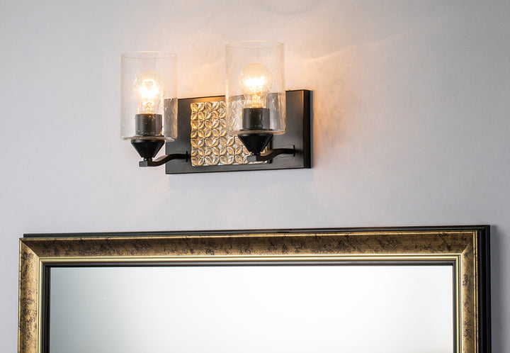 Clean lines and timeless design this double vanity light is perfect for brightening your bathroom space giving it texture and dimension. Featuring a clean-cut rectangle backplate with textured traditional shapes, simple curved arm and a unique two-toned finish of matte black and antique silver. Showing off its contemporary side, this 2-light bathroom light uses a cylinder shaped clear seeded glass to bring attention to the mix of texture and details that come together in our Arcadia collection. Measuring 13" Wide, 8" in height and 6.5" in depth, this two-light vanity light can fit in nearly any space.