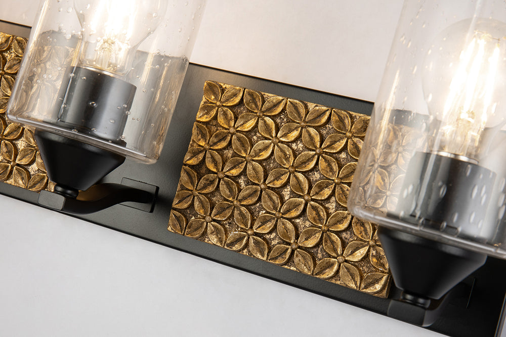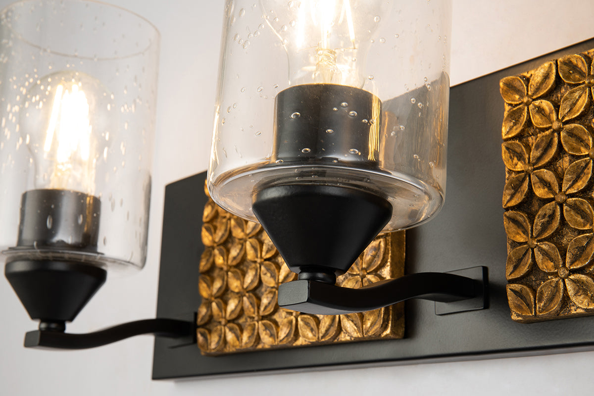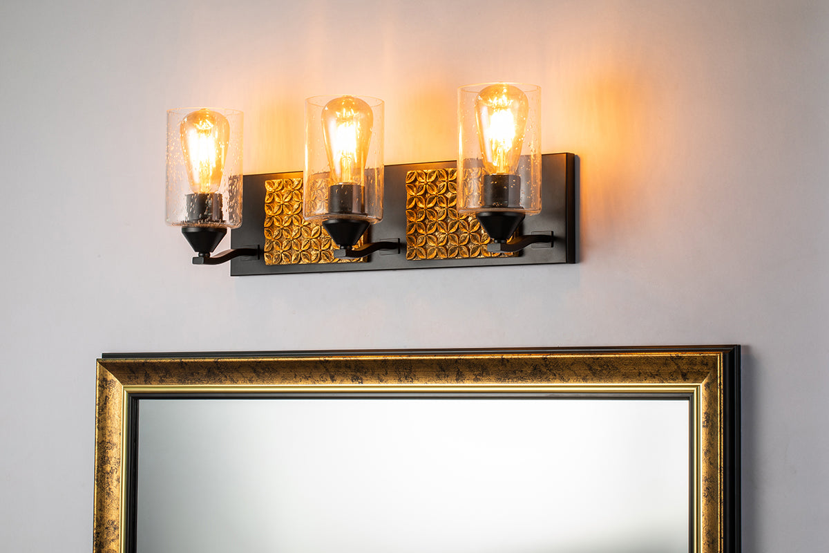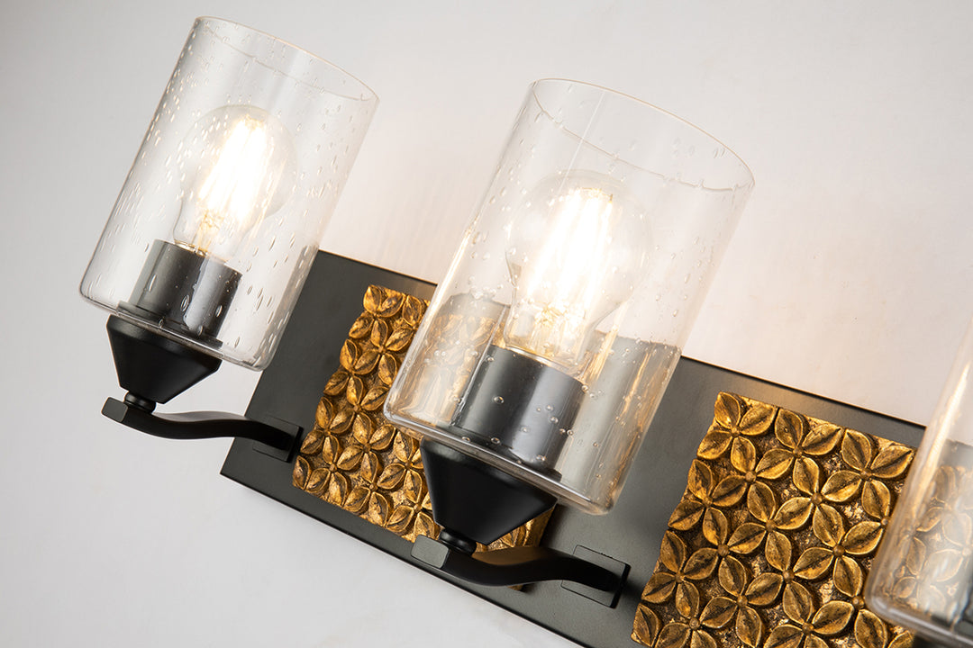 Clean lines and timeless design this triple vanity light is perfect for brightening your bathroom space giving it texture and dimension. Featuring a clean-cut rectangle backplate with textured traditional shapes, simple curved arm and a unique two-toned finish of matte black and antique gold. Showing off its contemporary side, this 3-light bathroom light uses a cylinder shaped clear seeded glass to bring attention to the mix of texture and details that come together in our Arcadia collection. Measuring 23" Wide, 8" in height and 6.5" in depth, this three-light vanity light can fit in nearly any space.