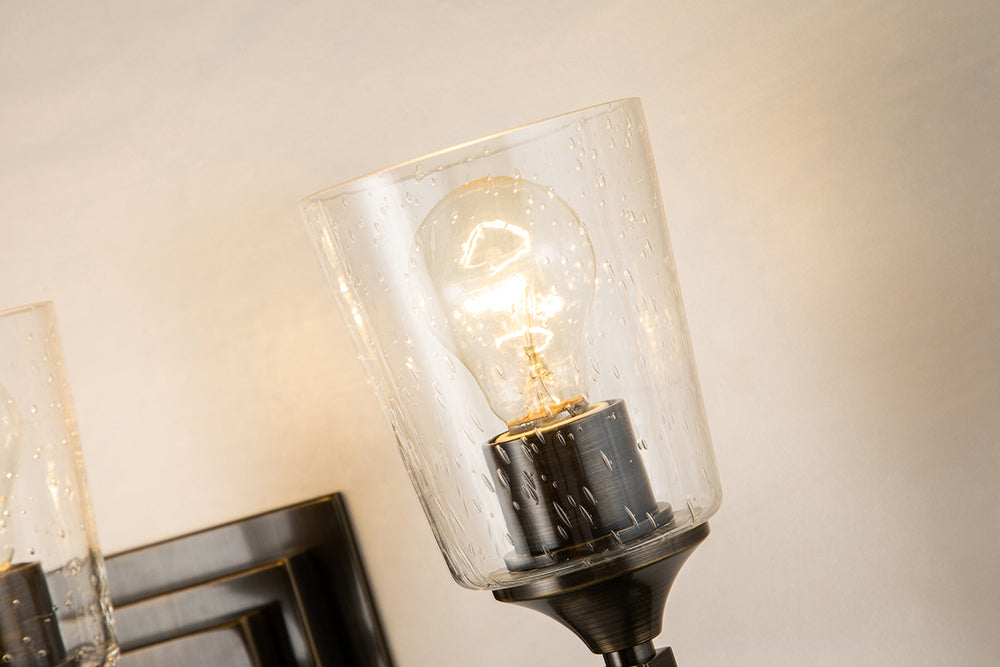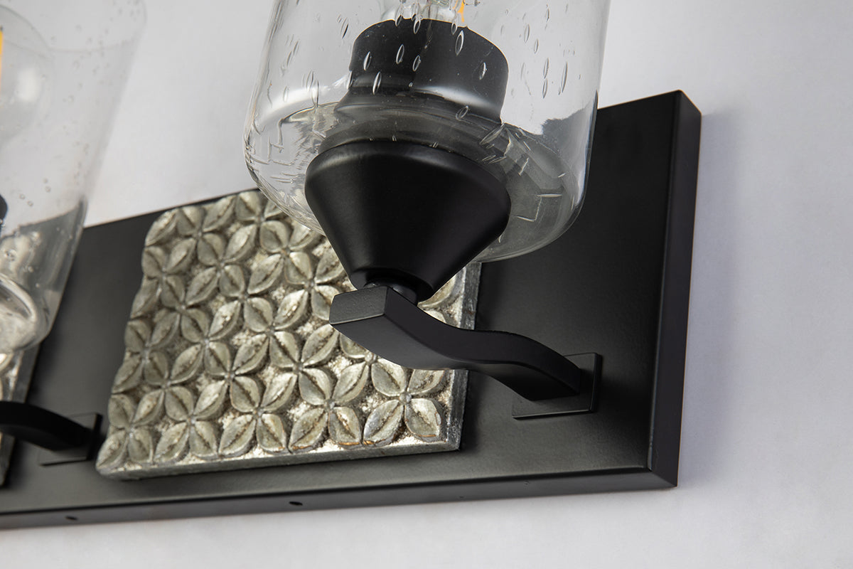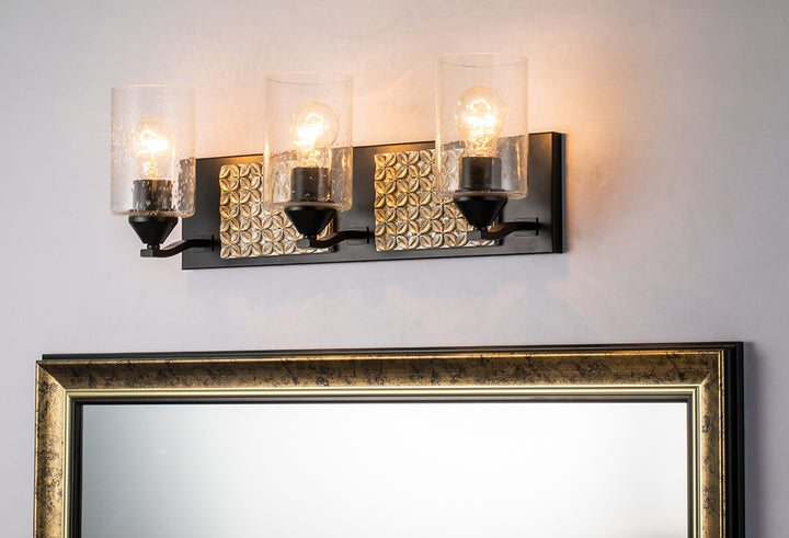 Clean lines and timeless design this triple vanity light is perfect for brightening your bathroom space giving it texture and dimension. Featuring a clean-cut rectangle backplate with textured traditional shapes, simple curved arm and a unique two-toned finish of matte black and antique silver. Showing off its contemporary side, this 3-light bathroom light uses a cylinder shaped clear seeded glass to bring attention to the mix of texture and details that come together in our Arcadia collection. Measuring 23" Wide, 8" in height and 6.5" in depth, this three-light vanity light can fit in nearly any space.