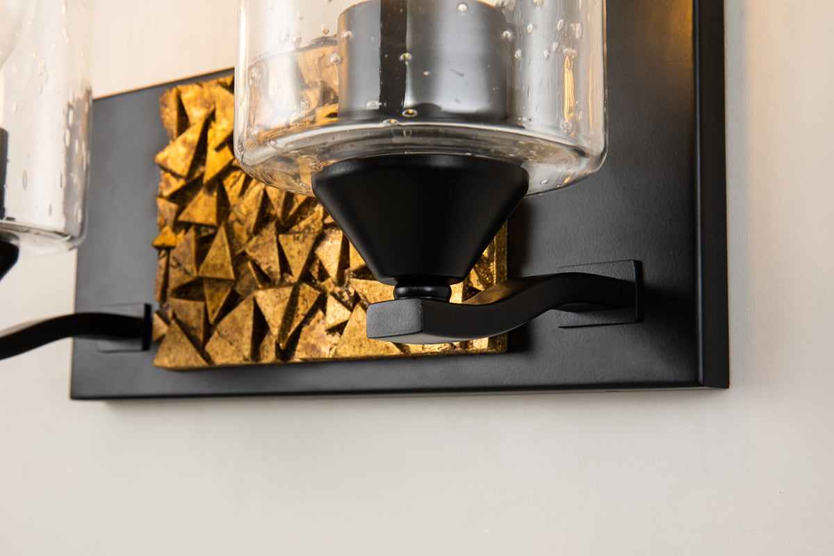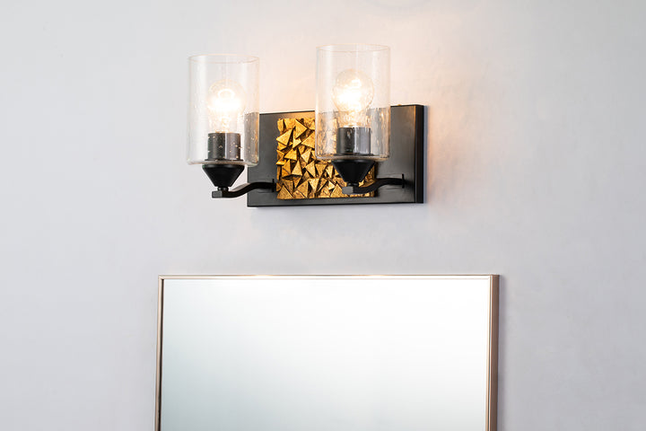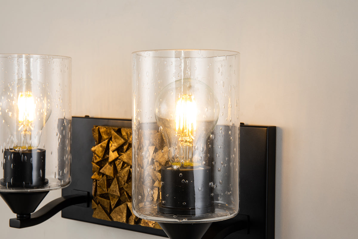Clean lines and timeless design this double vanity light is perfect for brightening your bathroom space giving it texture and dimension. Featuring a clean-cut rectangle backplate with textured traditional shapes, simple curved arm and a unique two-toned finish of matte black and antique gold. Showing off its contemporary side, this 2-light bathroom light uses a cylinder shaped clear seeded glass to bring attention to the mix of texture and details that come together in our Bocage collection. Measuring 13" Wide, 8" in height and 6.5" in depth, this two-light vanity light can fit in nearly any space.