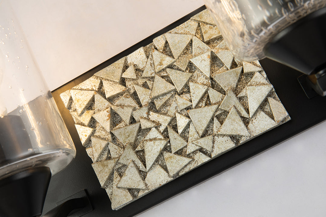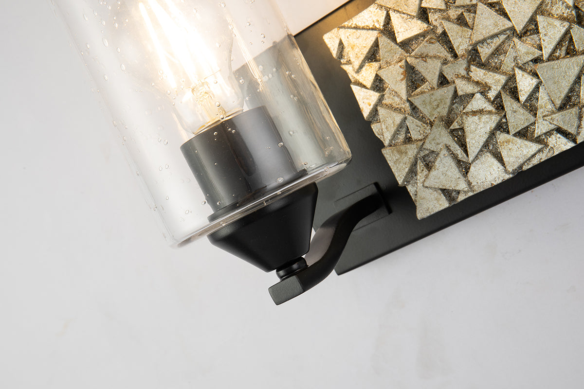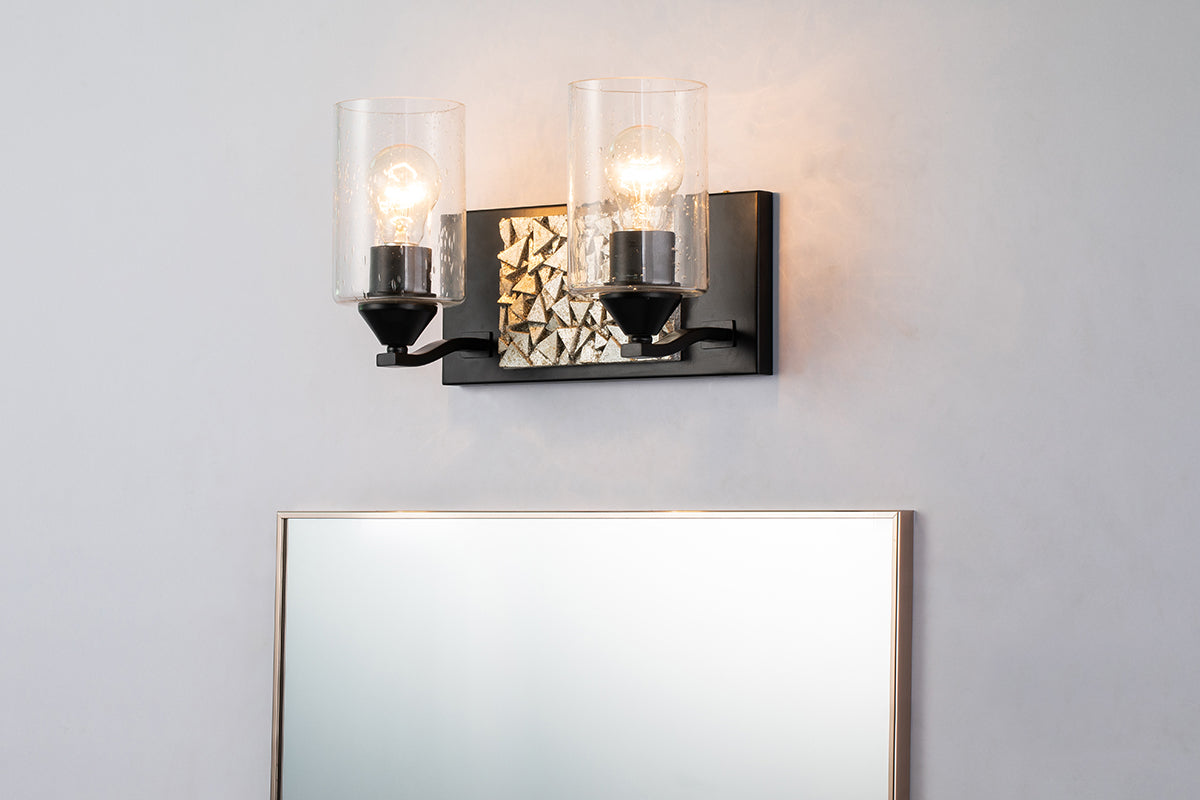 Clean lines and timeless design this double vanity light is perfect for brightening your bathroom space giving it texture and dimension. Featuring a clean-cut rectangle backplate with textured traditional shapes, simple curved arm and a unique two-toned finish of matte black and antique silver. Showing off its contemporary side, this 2-light bathroom light uses a cylinder shaped clear seeded glass to bring attention to the mix of texture and details that come together in our Bocage collection. Measuring 13" Wide, 8" in height and 6.5" in depth, this two-light vanity light can fit in nearly any space.