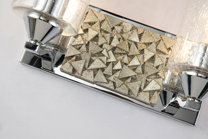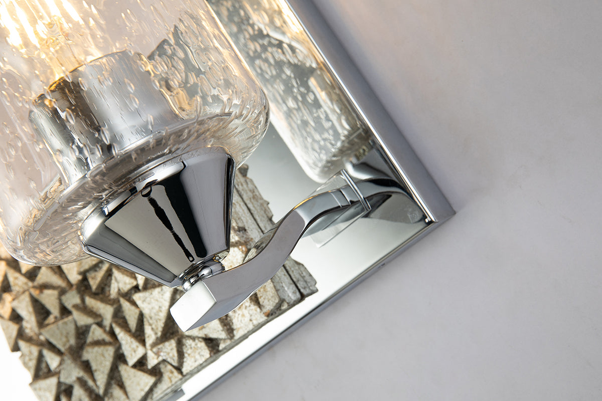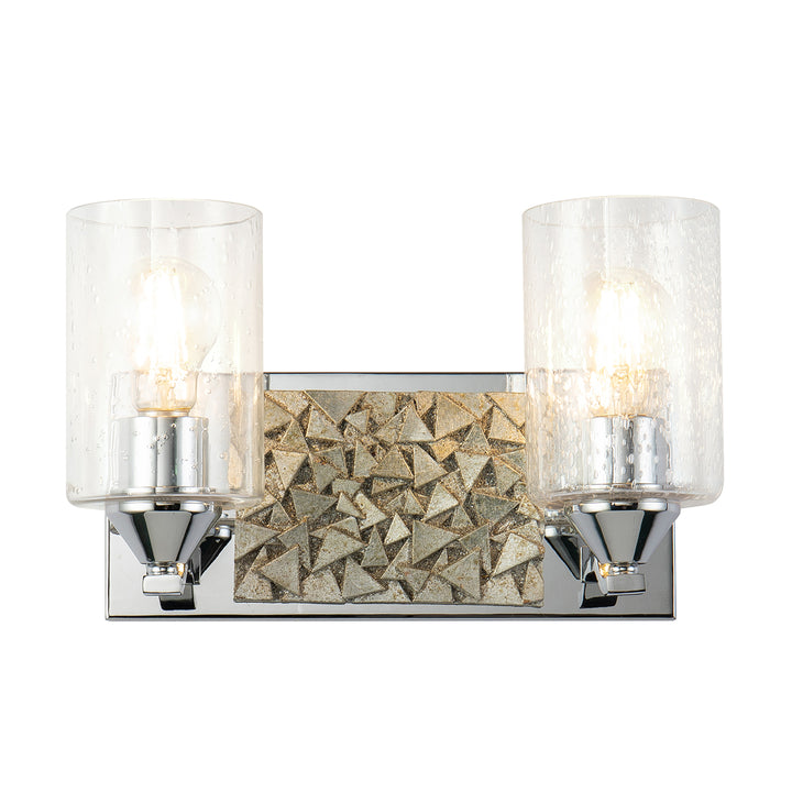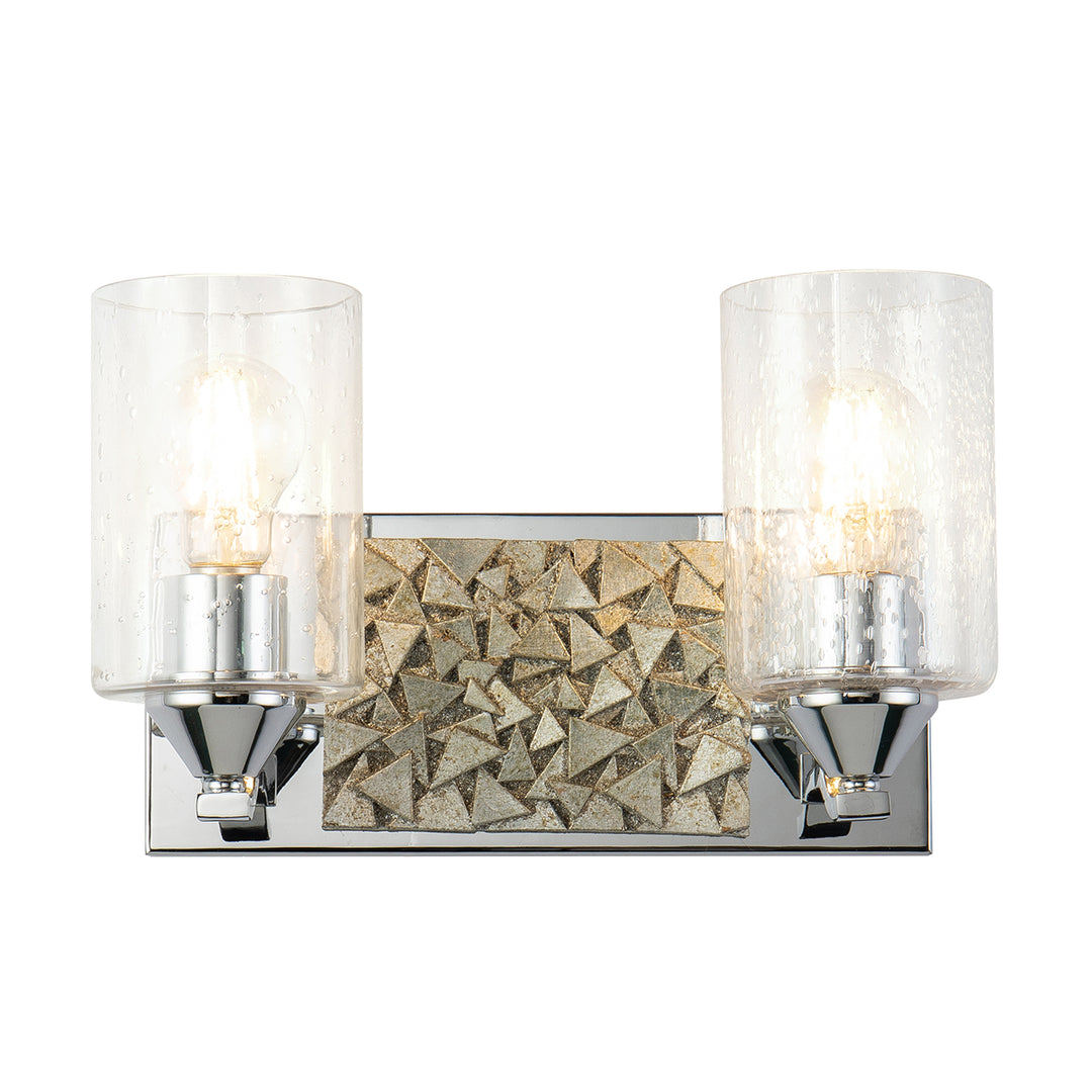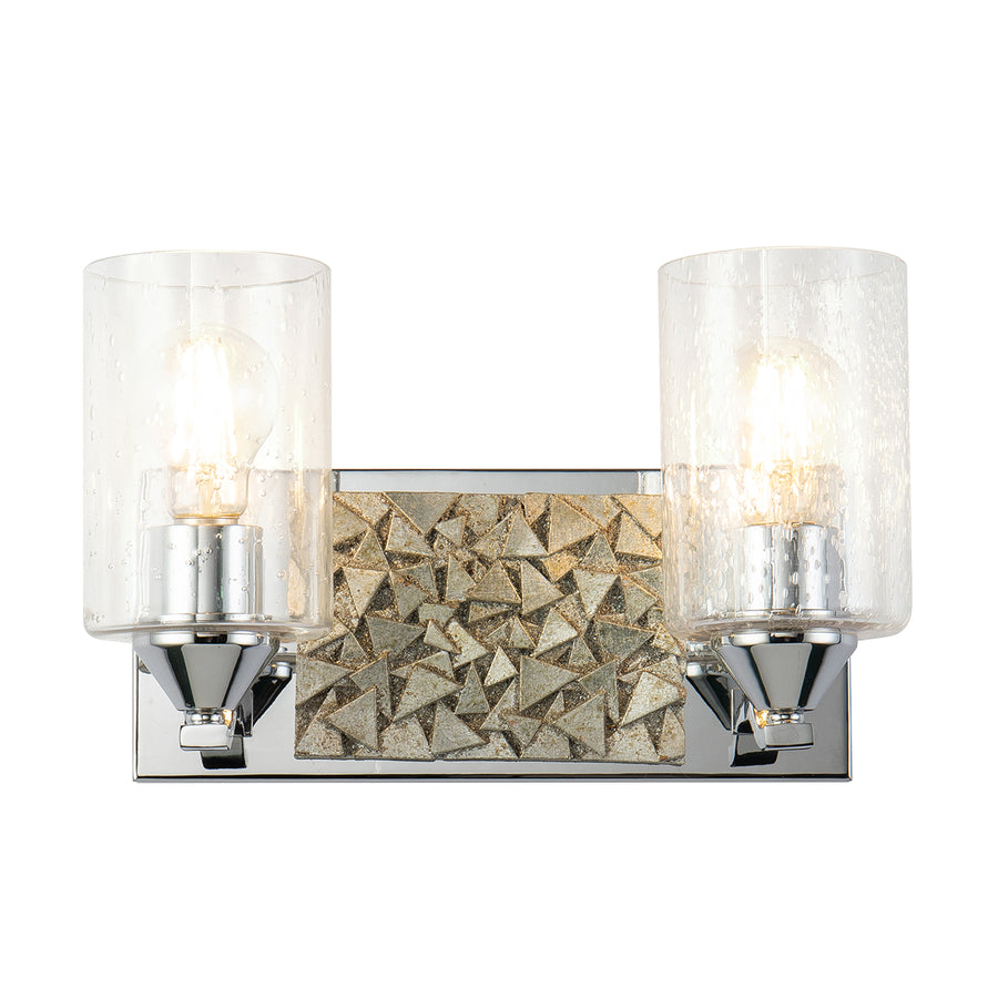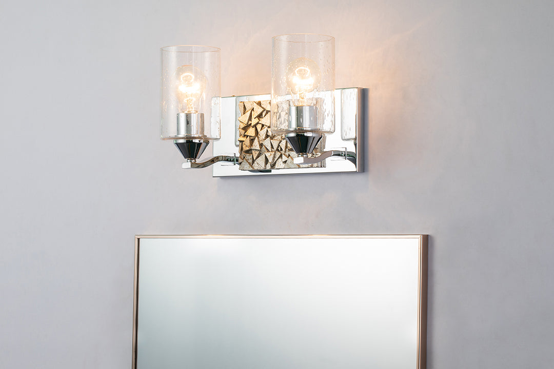 Clean lines and timeless design this double vanity light is perfect for brightening your bathroom space giving it texture and dimension. Featuring a clean-cut rectangle backplate with textured traditional shapes, simple curved arm and a unique two-toned finish of polished chrome and antique silver. Showing off its contemporary side, this 2-light bathroom light uses a cylinder shaped clear seeded glass to bring attention to the mix of texture and details that come together in our Bocage collection. Measuring 13" Wide, 8" in height and 6.5" in depth, this two-light vanity light can fit in nearly any space.