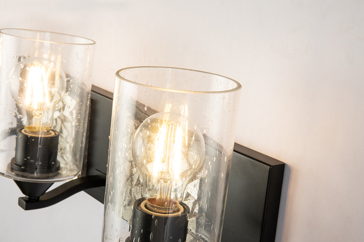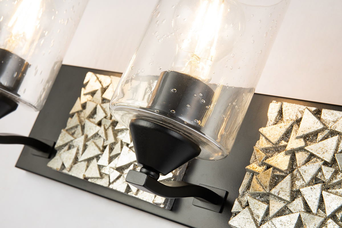 Clean lines and timeless design this triple vanity light is perfect for brightening your bathroom space giving it texture and dimension. Featuring a clean-cut rectangle backplate with textured traditional shapes, simple curved arm and a unique two-toned finish of matte black and antique silver. Showing off its contemporary side, this 3-light bathroom light uses a cylinder shaped clear seeded glass to bring attention to the mix of texture and details that come together in our Bocage collection. Measuring 23" Wide, 8" in height and 6.5" in depth, this three-light vanity light can fit in nearly any space.