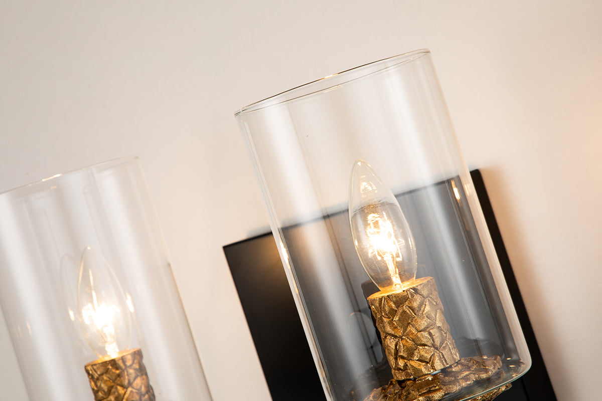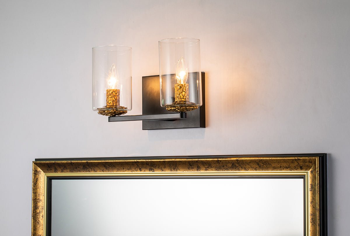 Charming and vintage inspired, the Bolivar 2-light vanity bathroom fixture uses a mixed gold and Matte black finishes to give a genuine and edgy candle style design that shows off the antique gold detail used on the candle sleeve. This two-light bath bar has cylinder shaped clear glass, and uses a modern crisp shape to update your bathroom space. The rectangle back plate finished in a sophisticated matte black s is the perfect finishing detail.