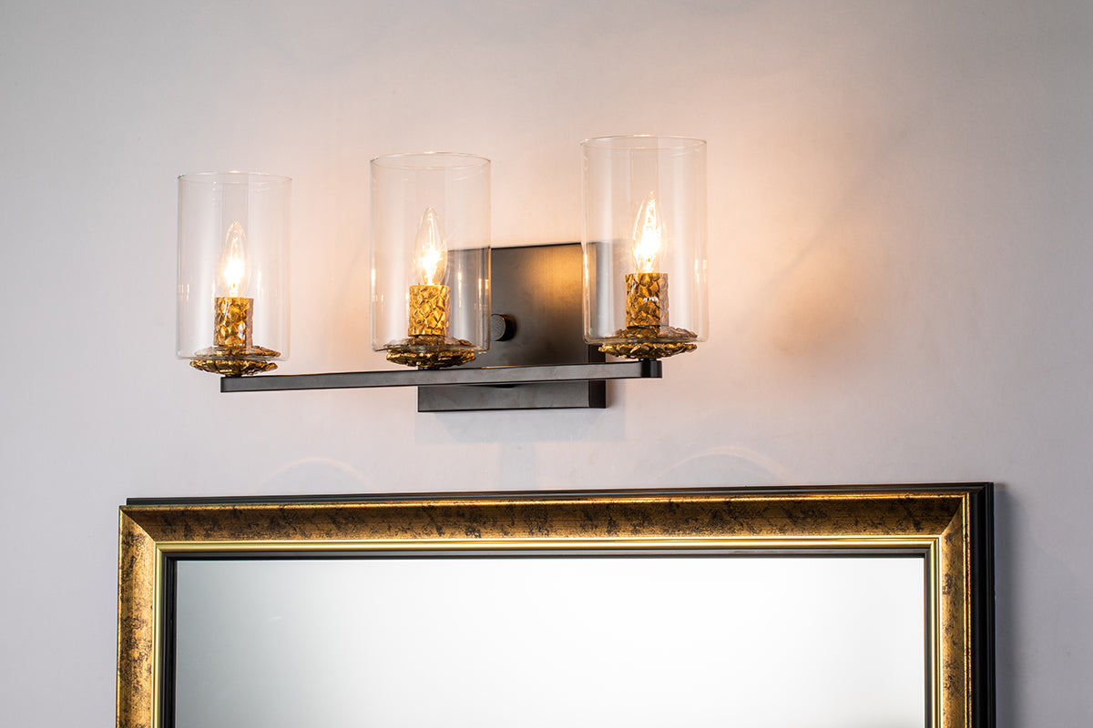Charming and vintage inspired, the Bolivar 3-light vanity bathroom fixture uses a mixed gold and Matte black finishes to give a genuine and edgy candle style design that shows off the antique gold detail used on the candle sleeve. This three-light bath bar has cylinder shaped clear glass, and uses a modern crisp shape to update your bathroom space. The rectangle back plate finished in a sophisticated matte black s is the perfect finishing detail.