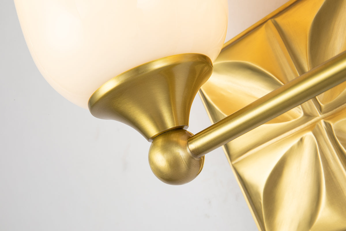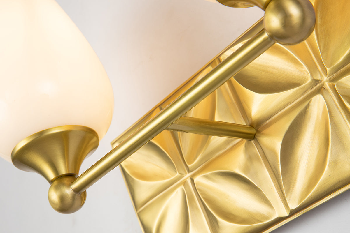 Always looking to add texture and dimension to a room, we created the perfect 2-light bathroom vanity light. The 14 inch back plate with a pressed textured shape creates a modern design completing our intent. Showcasing the elegant aged brass finish and sleek wine glass-shaped, opal glass shades that can be mounted either up or down, we are giving that extra touch to show our attention to design and our love for the details.