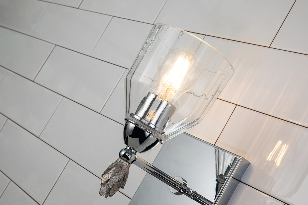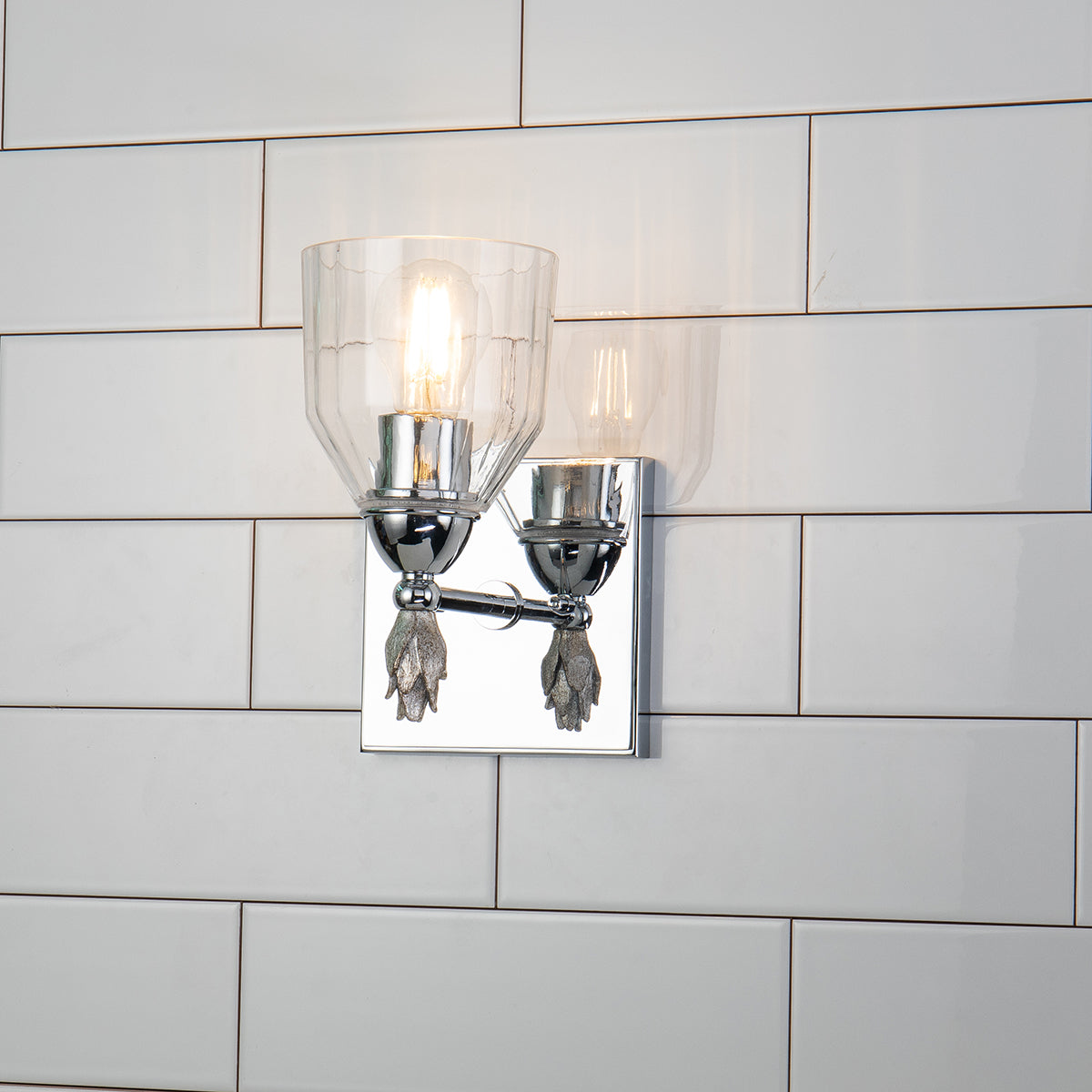Drawing inspiration from a classic design, this polished chrome 1-light vanity wall sconce is the perfect pick for any contemporary or traditional space. This uniqe finial design showcases a simple, rectangular 5" square backplate, dome shaped glass shade, and a decorative unique flame-shaped silver finial. Easily installed in pairs on either side of a mirror or art work, this one-light sconce is suitable for damp spaces, and is finished in a beautiful polished chrome.