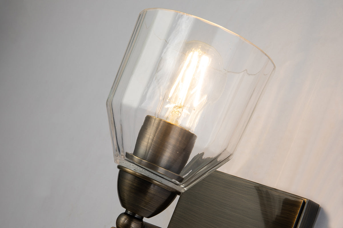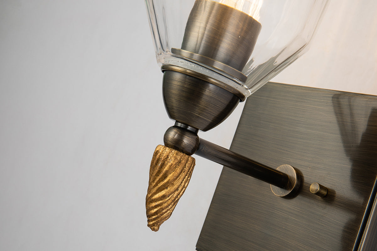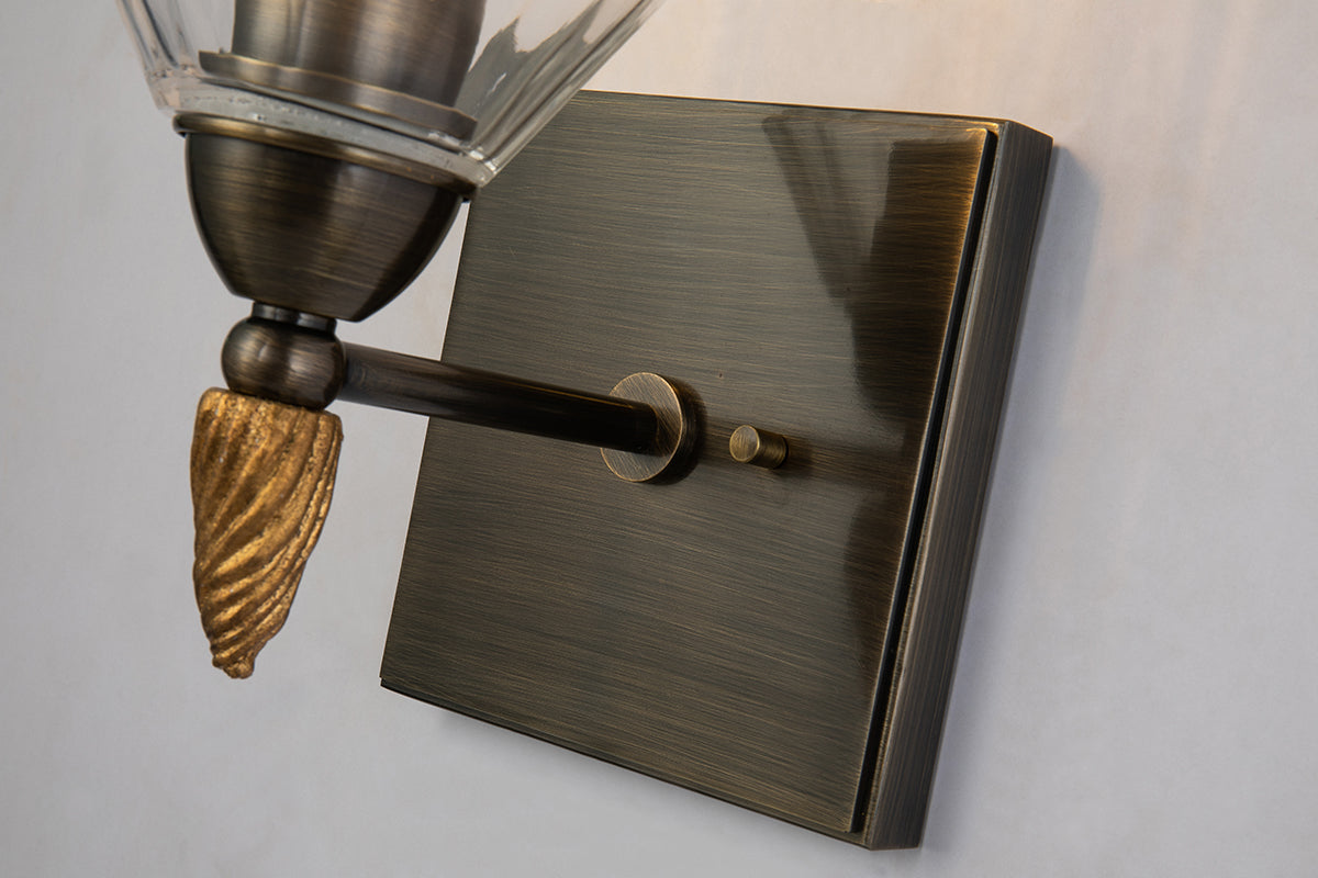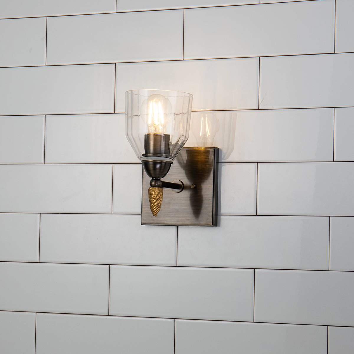 Drawing inspiration from a classic design, this black and gold 1-light vanity wall sconce is the perfect pick for any contemporary or traditional space. This Felice design showcases a simple, rectangular 5" square backplate, dome shaped glass shade, and a decorative unique acorn-shaped gold finial. Easily installed in pairs on either side of a mirror or art work, this one-light sconce is suitable for damp spaces, and is finished in a beautiful matte black