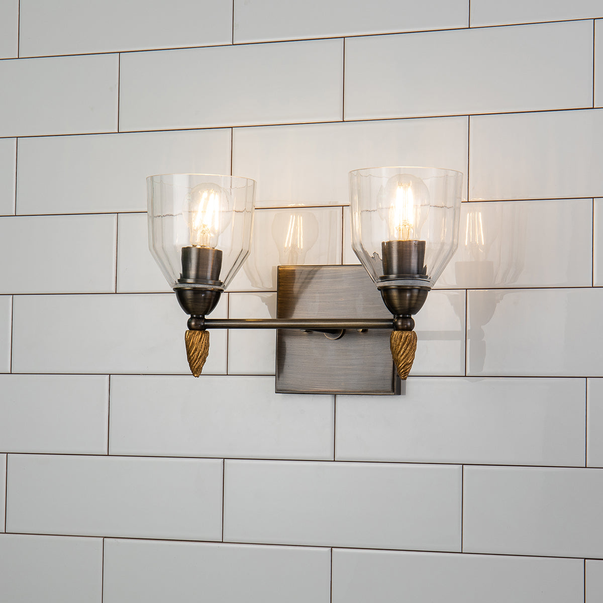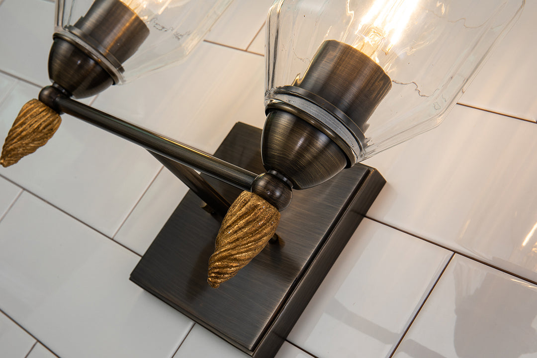 Drawing inspiration from a classic design, this 2-light vanity light is the perfect pick for any contemporary or traditional space. This Felice design showcases a simple, rectangular 5" square backplate, dome shaped glass shade, and a decorative unique acorn-shaped gold finial. Easily installed over your mirror, this two-light sconce is suitable for damp spaces, and is finished in a beautiful matte black.