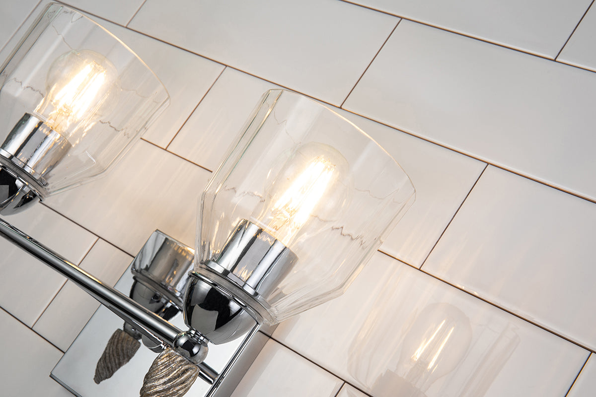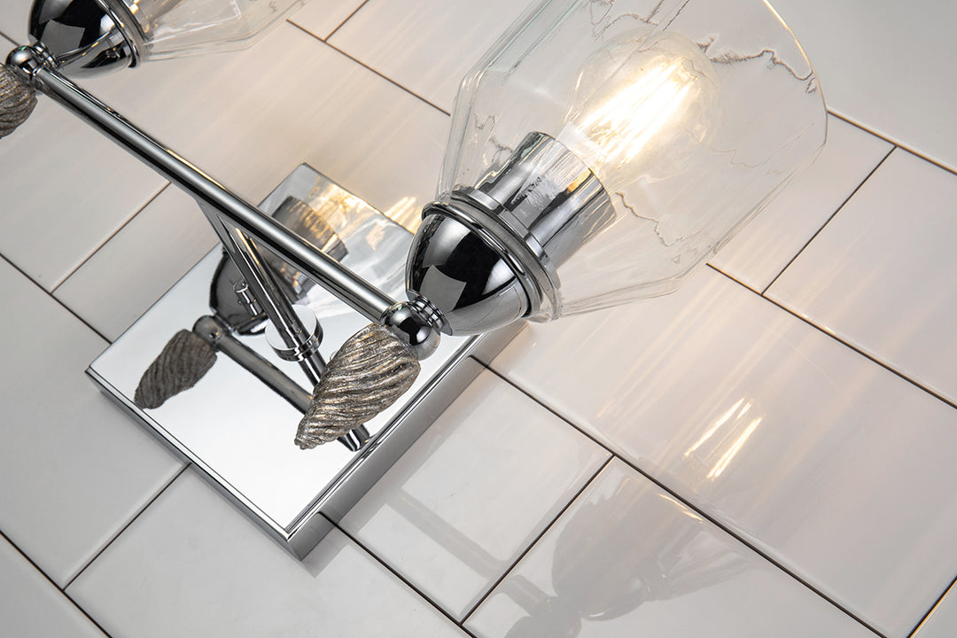 Drawing inspiration from a classic design, this polished chrome 2-light vanity light is the perfect pick for any contemporary or traditional space. This Felice design showcases a simple, rectangular 5 square backplate, dome shaped glass shade, and a decorative unique acorn-shaped gold finial. Easily installed over your mirror, this two-light sconce is suitable for damp spaces, and is finished in a beautiful polished chrome.