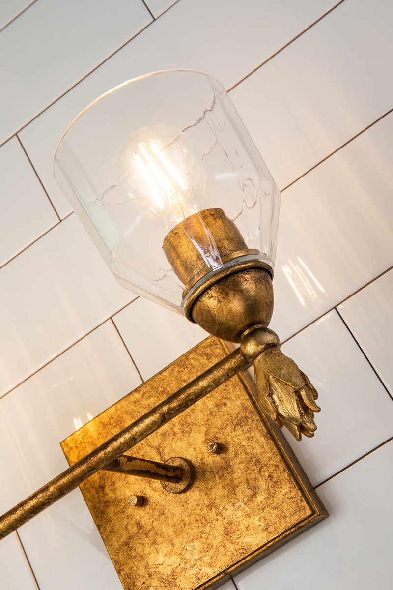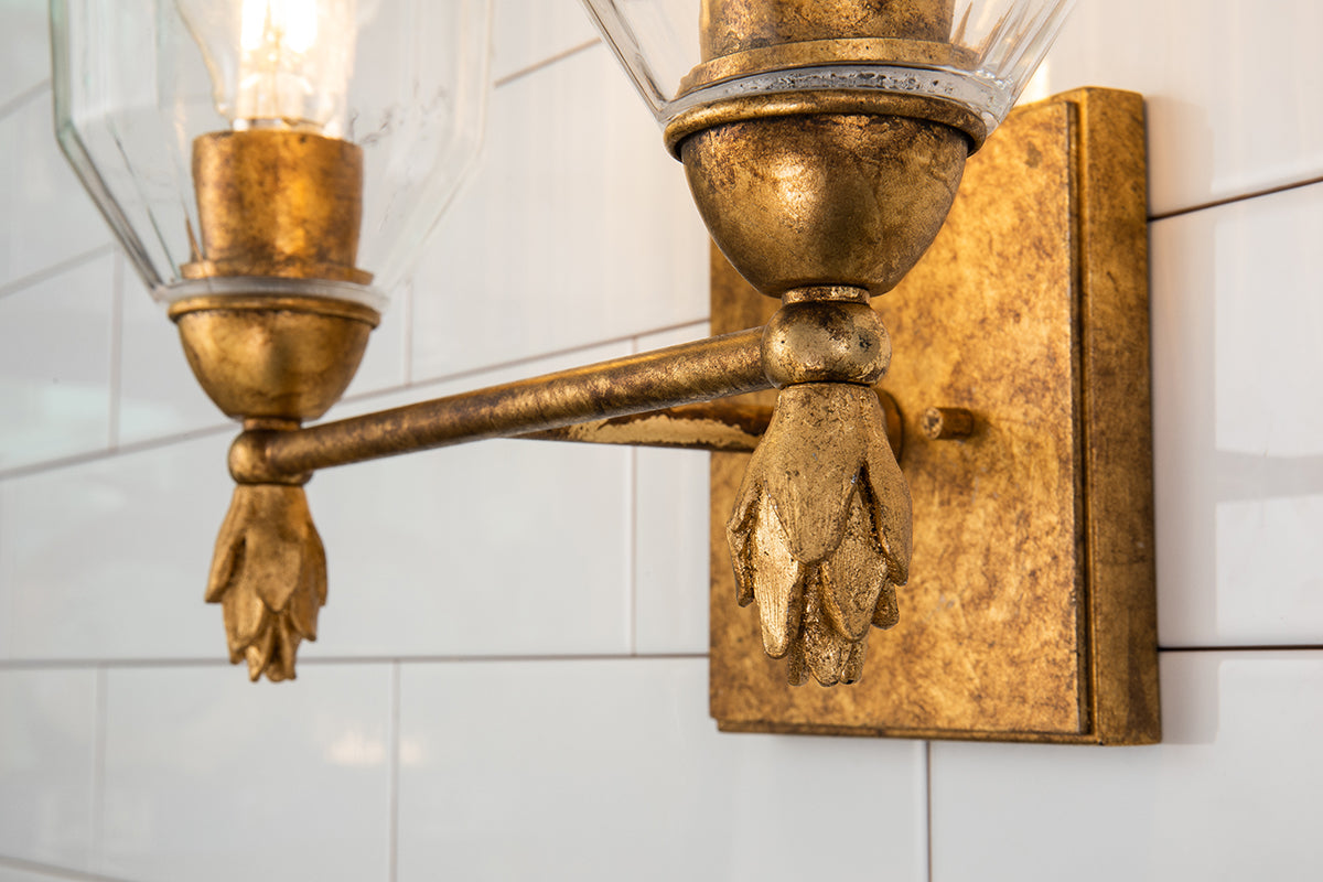 Drawing inspiration from a classic design, this polished chrome 2-light vanity light is the perfect pick for any contemporary or traditional space. This Felice design showcases a simple, rectangular 5" square backplate, dome shaped glass shade, and a decorative unique flame-shaped gold finial. Easily installed over your mirror, this two-light sconce is suitable for damp spaces, and is finished in a beautiful antique gold