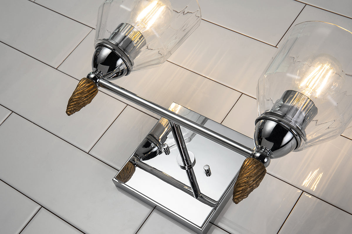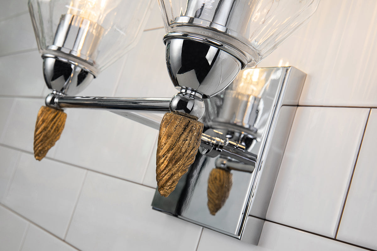 Drawing inspiration from a classic design, this silver and gold 2-light vanity light is the perfect pick for any contemporary or traditional space. This Felice design showcases a simple, rectangular 5" square backplate, dome shaped glass shade, and a decorative unique acorn-shaped gold finial. Easily installed over your mirror, this two-light sconce is suitable for damp spaces, and is finished in a beautiful polished chrome.