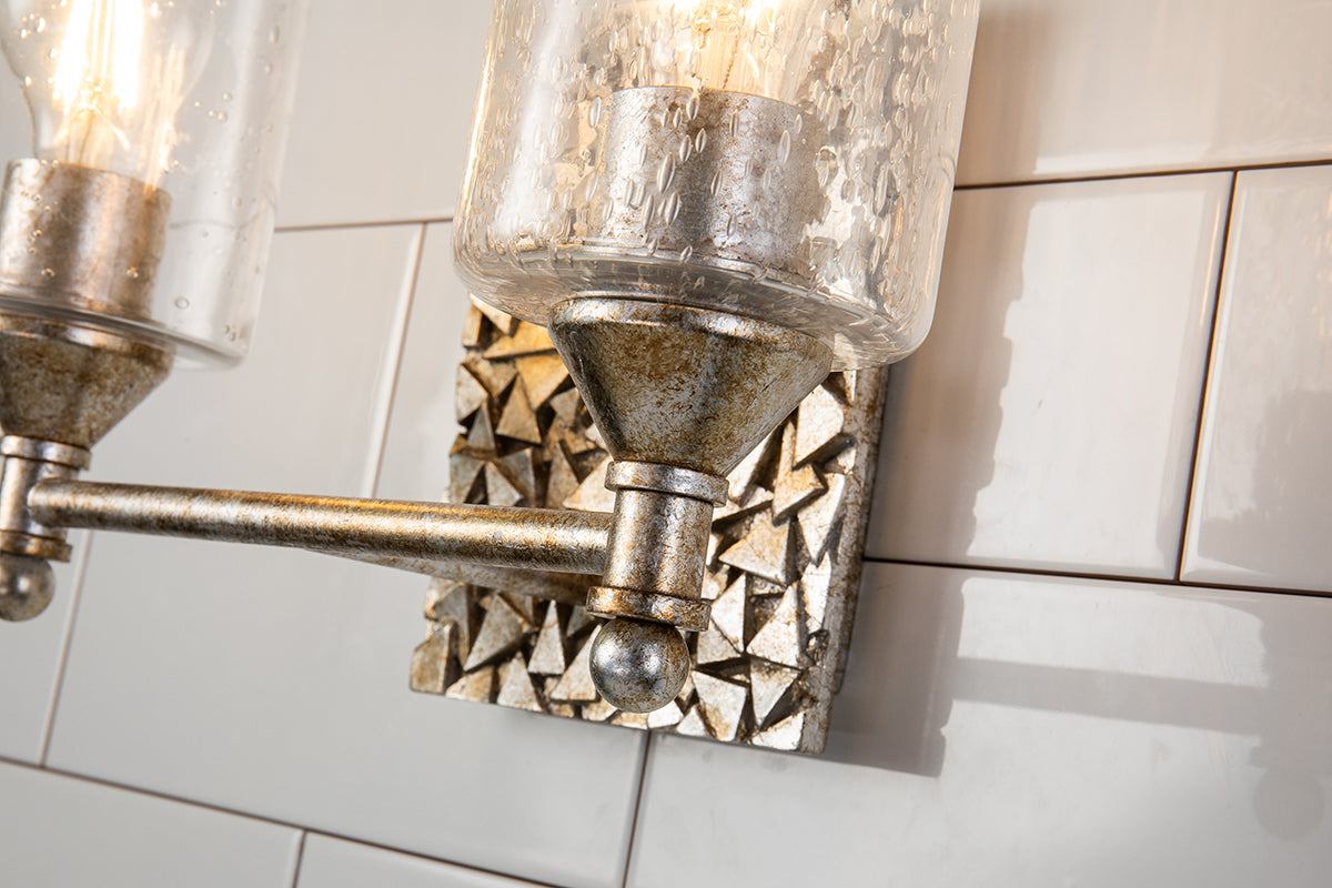 This eye-catching centerpiece uses pieces of our Mosaic collection for inspiration, giving this 2 light bath bar a unique and very charming finished look. Featuring a rectangular antique silver backplate, finish matched details, and clear seeded glass, this vanity light attaches securely to the wall blending beauty and functionality. The two-light over-the-mirror lighting fixtures has a length of 13.5 inches making it a perfect size for small or large bathroom installation. Reversable mounting adds another plus to this distressed silver bath bar fixture.