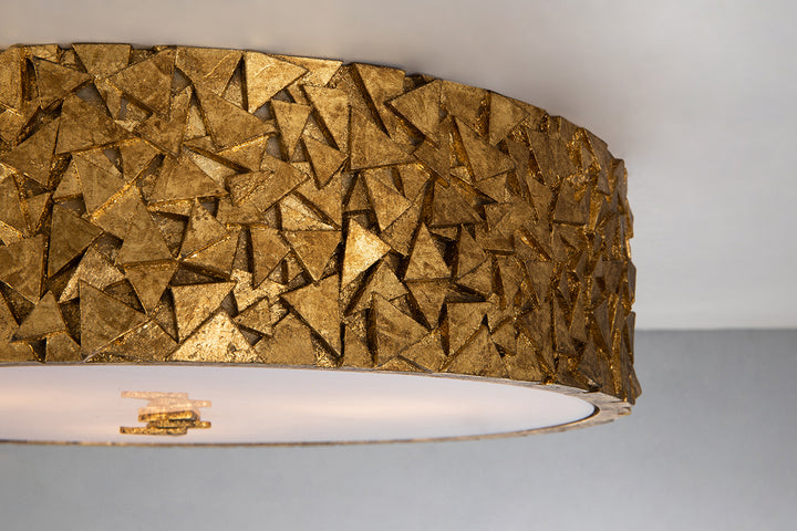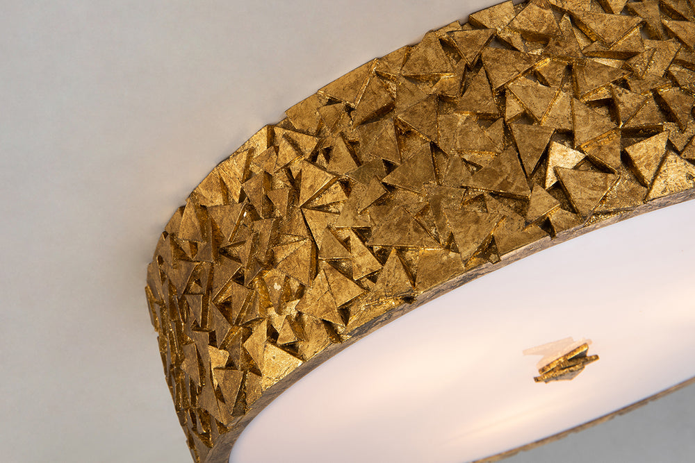 This eye-catching centerpiece uses pieces of our Mosaic collection for inspiration, giving this 3 light flush mounted ceiling light a very charming and finished look. Using the 16 inch round shape for a touch of modern, this antique gold flush mount fixture has the best of both a traditional and contempory design. Using a diffused white glass to give off a crisp and flattering light, making this ceiling fixture a great look to finish a bedroom, closet, or living room.
