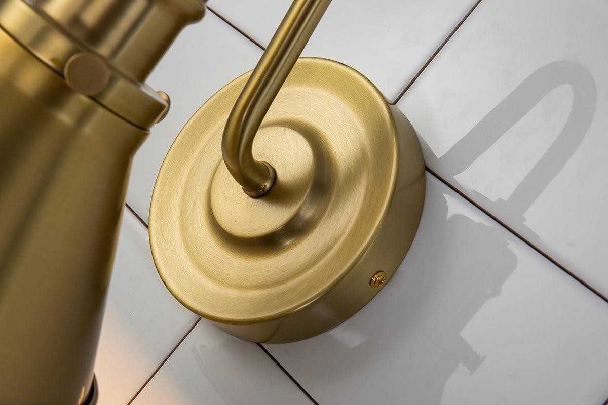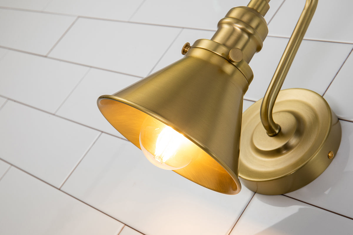 An updated take on a charming classic, the Provence one-light bath sconce in aged brass brings a touch of modern farmhouse design as it give functional style to your quaint bathroom space. The single arched arm and round backplate are featured here, and combine perfectly with the industrial details used to accent the cone shaped shade. Suitable for damp spaces, this 1-light sconce can be easily installed on either side of a mirror or piece of art to continue the vintage-inspired design trend into any room of your home.