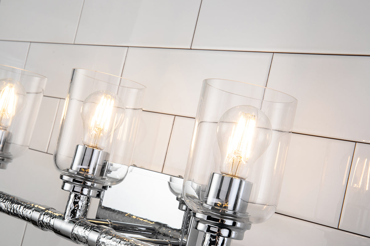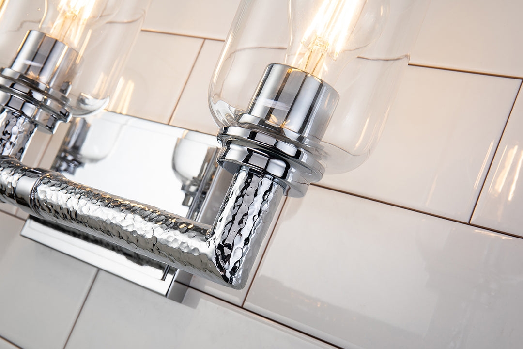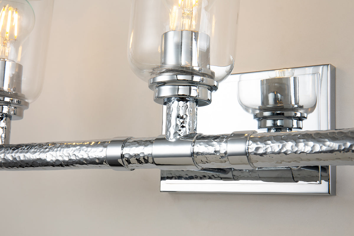 A contemporary design with a rustic appeal, this versatile vanity light adds a modern touch in a minimalistic way. Strong and sophisticated lines are softened with the hammered detail, and the clear, slightly curved cylinder glass gives off the perfect amount of light for beauty and function. With the length of 24 inches, this three light bath bar light is perfect for over-the-mirror installation, and is finished in polished chrome.