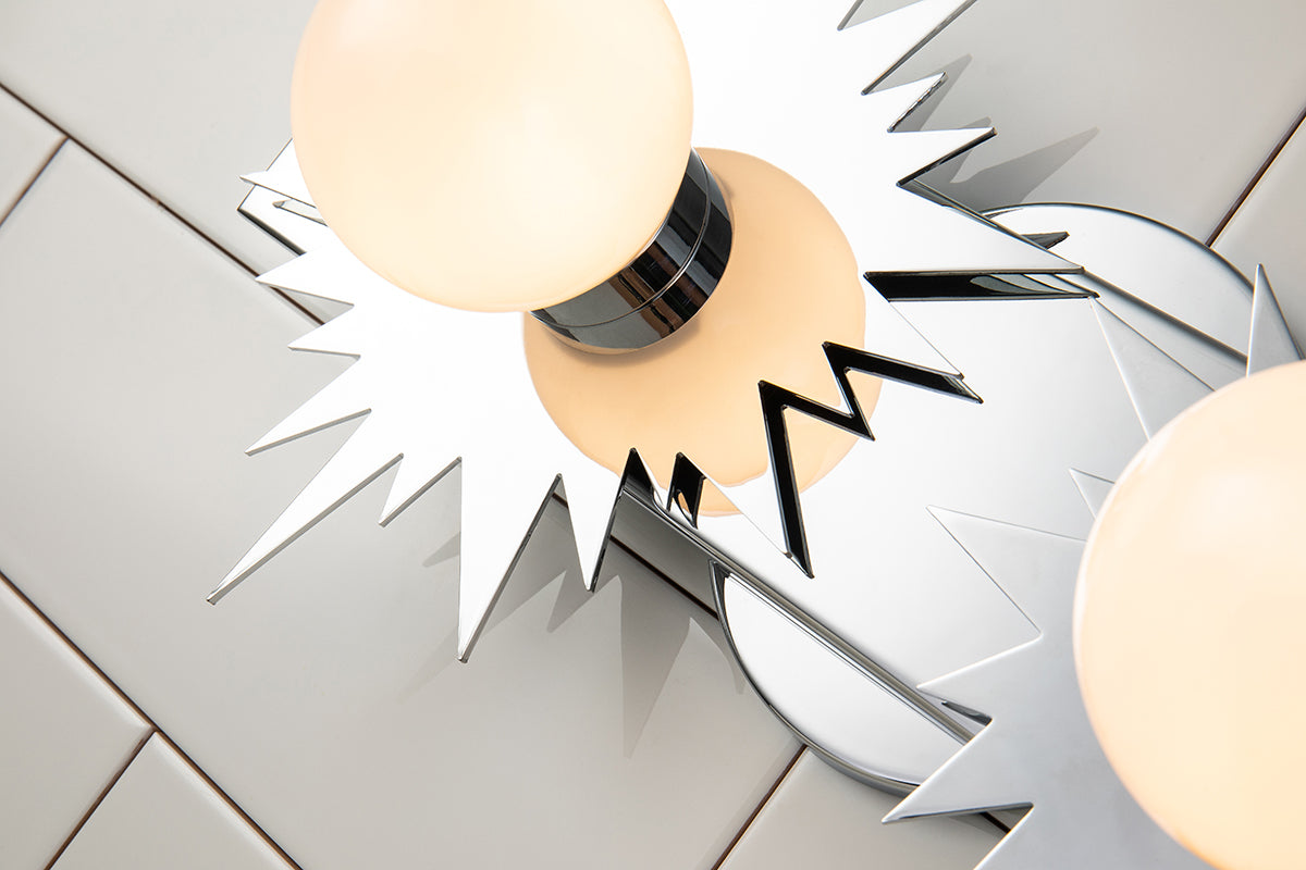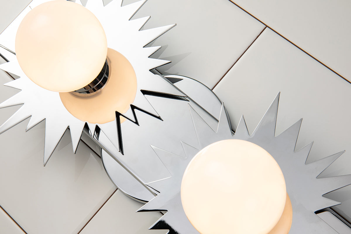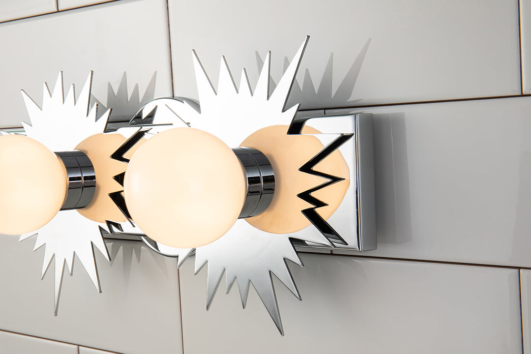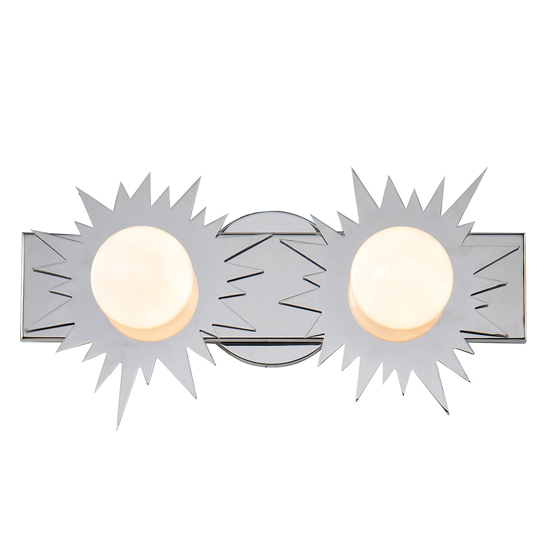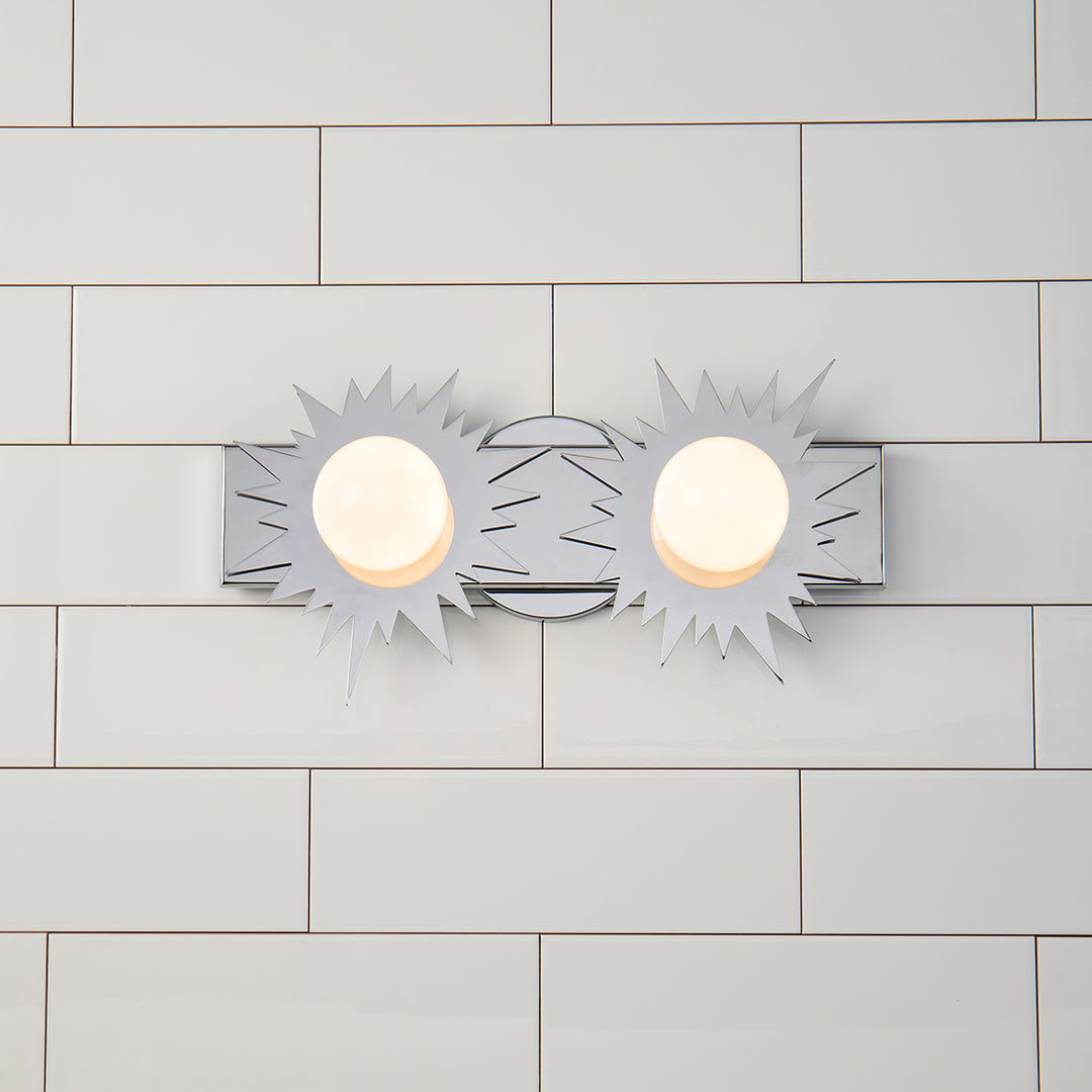 Looking to lighten up your space with a whimsical and art-inspired piece? Designed using a statement-making sun shape , this two-light vanity light is the favorite pick for installing in pairs over your favorite mirrors. Creating an eye-catching focal point, this 2- light star shaped bath light is unique enough to work in the most sophisticated spaces, and using the polished chrome finish to add a little more drama to your bathroom space. Measuring 16 " in length, 8.5" in height and 4.5" in depth, the Soleil bathroom light can easily help to updated bathroom.