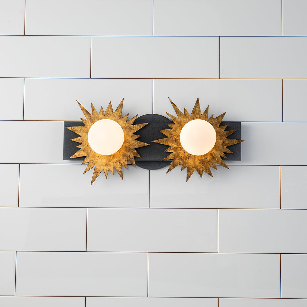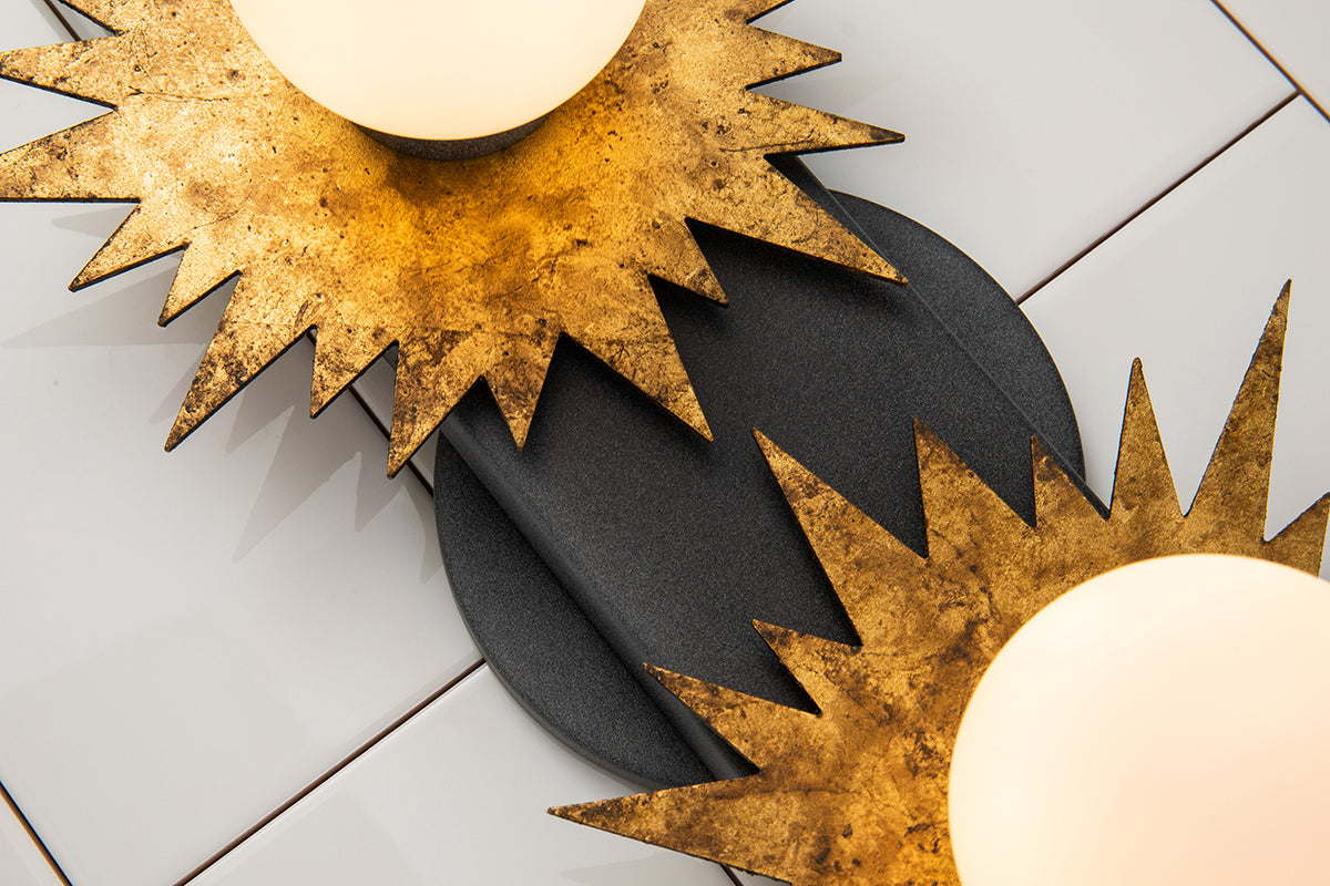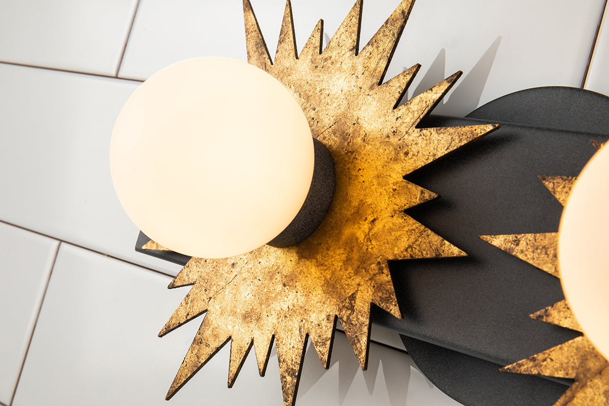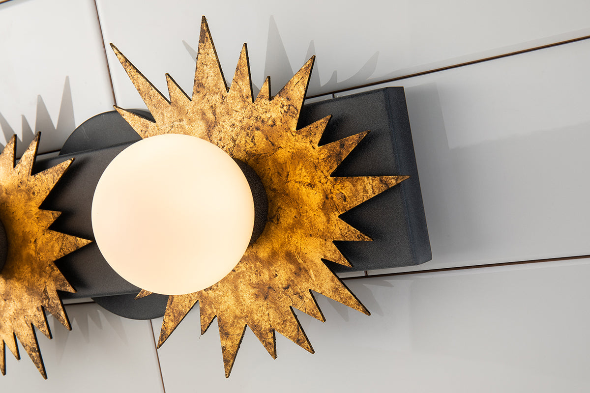 Looking to lighten up your space with a whimsical and art-inspired gold leaf and weathered black piece? Designed using a statement-making sun shape , this two-light wall sconce is the favorite pick for installing in pairs over your favorite mirrors. Creating an eye-catching focal point, this 2- light star shaped wall lantern is unique enough to work in the most sophisticated spaces, and using the mixed metal finishes, will give texture, depth, and add a little more drama to your bathroom, hallway or favorite reading nook. Measuring 16" in length, 8.5" in height and 4.5" in depth, the Soleil bathroom light can easily fit in any of your favorite spaces.