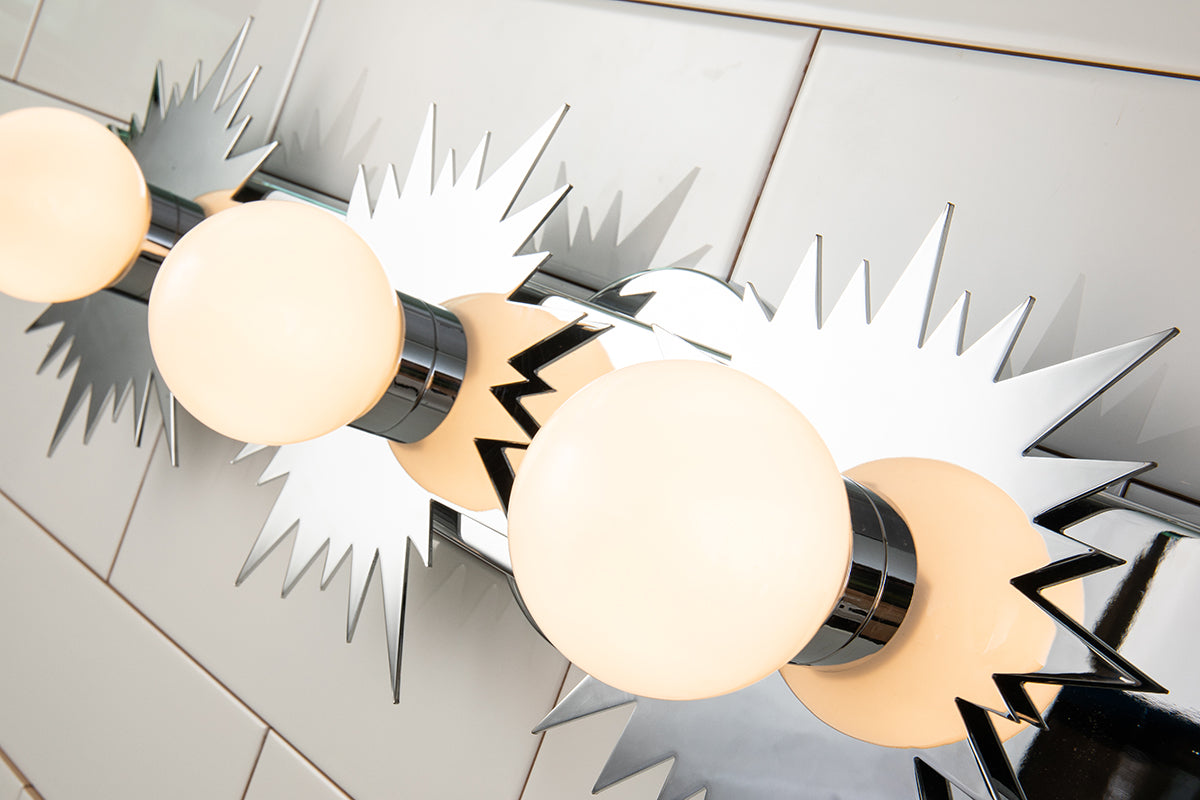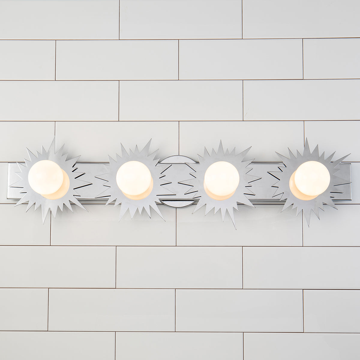 Looking to lighten up your space with a whimsical and art-inspired piece? Designed using a statement-making sun shape , this four-light vanity light is the favorite pick for installing over your favorite mirrors and double sinks. Creating an eye-catching focal point, this 4- light star shaped bath light is unique enough to work in the most sophisticated spaces, and using the polished chrome finish to add a little more drama to your bathroom space. Measuring 32" in length, 8.5" in height and 4.5" in depth, the Soleil bathroom light can easily help to updated bathroom.