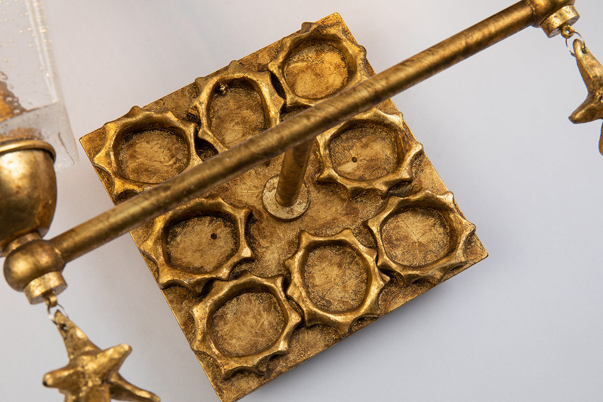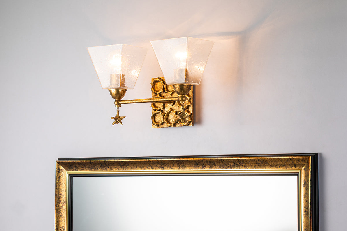 Designed using charming star pieces and unique shapes, this vanity light is the perfect pick for above mirror installation and creates an eye-catching focal point . Add a little glam and whimsy, with this 2-light bath bar that uses a layered antique gold finish and seedy pyramid shaped glass to give a sophisticated and fresh style. This bathroom light shows us that a length of 15.5 inches is perfect alone or installed in a pair.