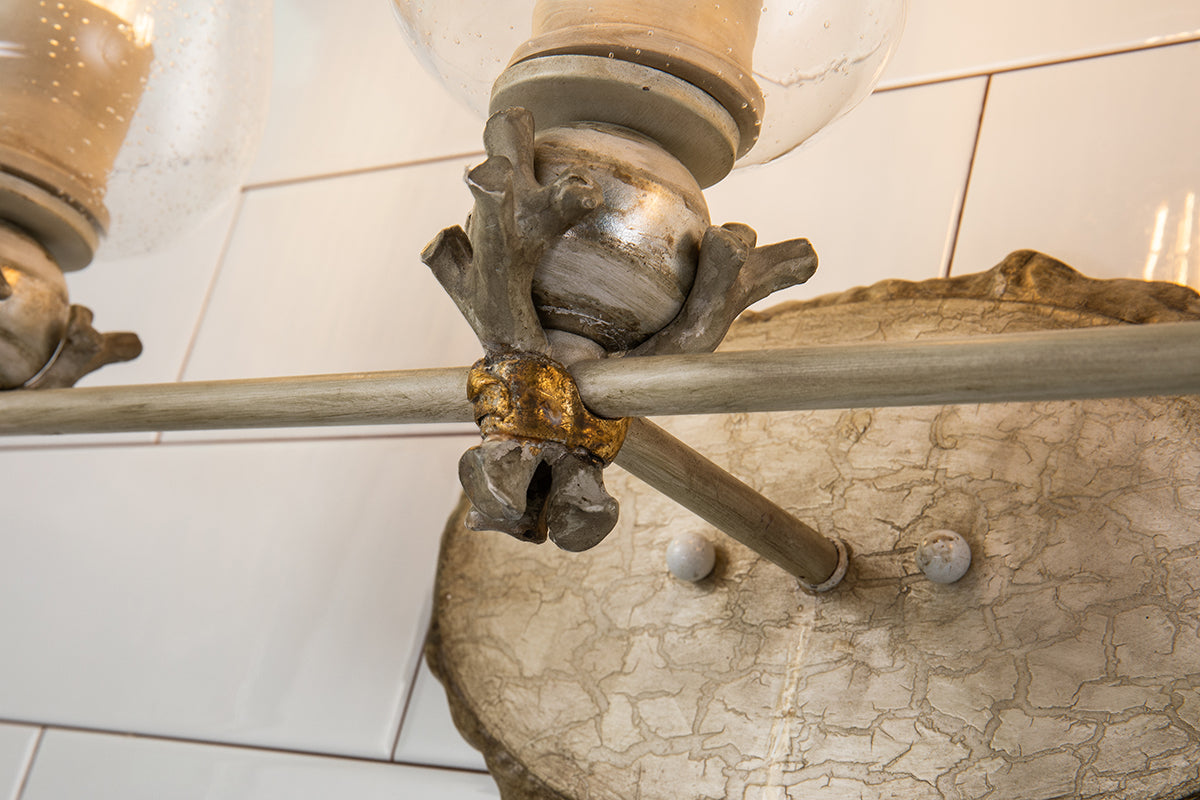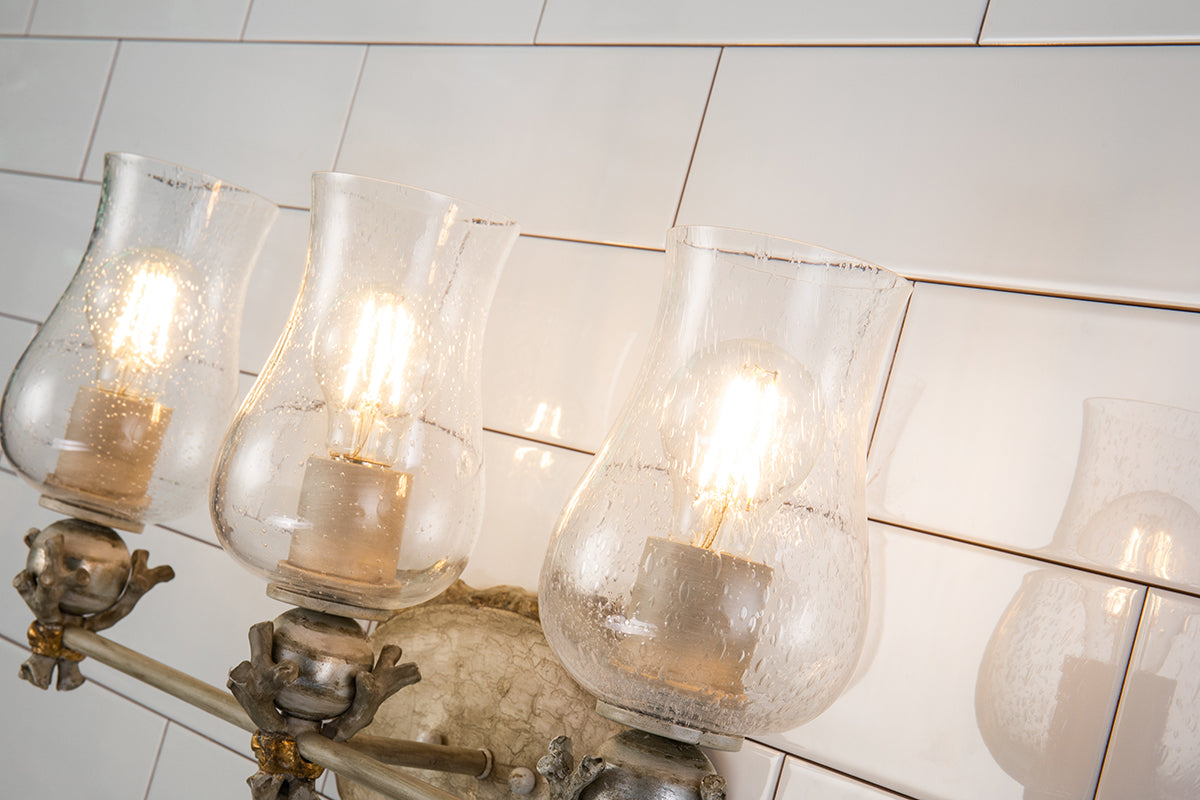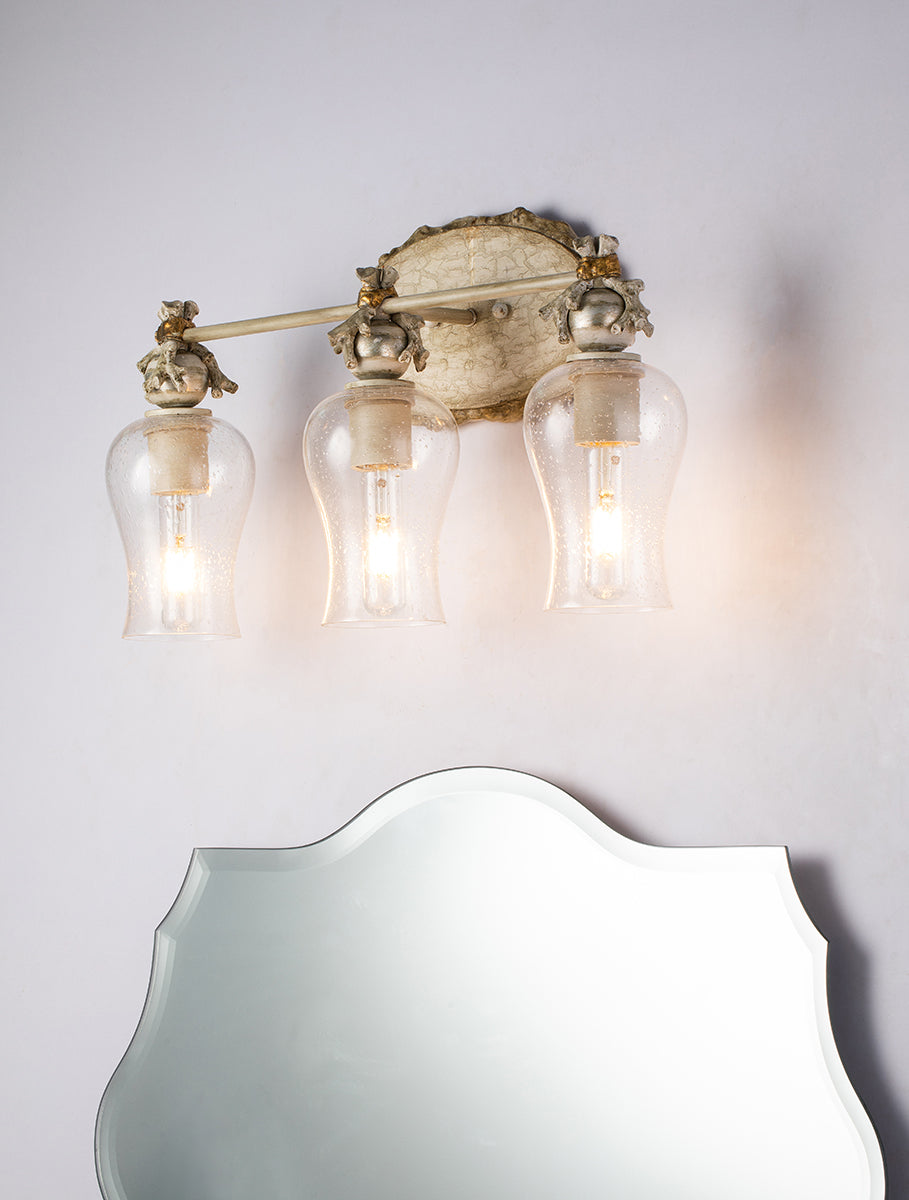 The Trellis 3-Light vanity light is a mix of old and new. With seedy clear glass in the vintage hurricane shape this three-light wall sconces is complemented with a neutral cream and silver oval back plate, and gold and silver orb accents are used to bring a whimsical outdoor feel. Added detailed edging gives depth into gold and brown hues, showing attention to detail, and a fresh new look in bathroom and living room lighting.