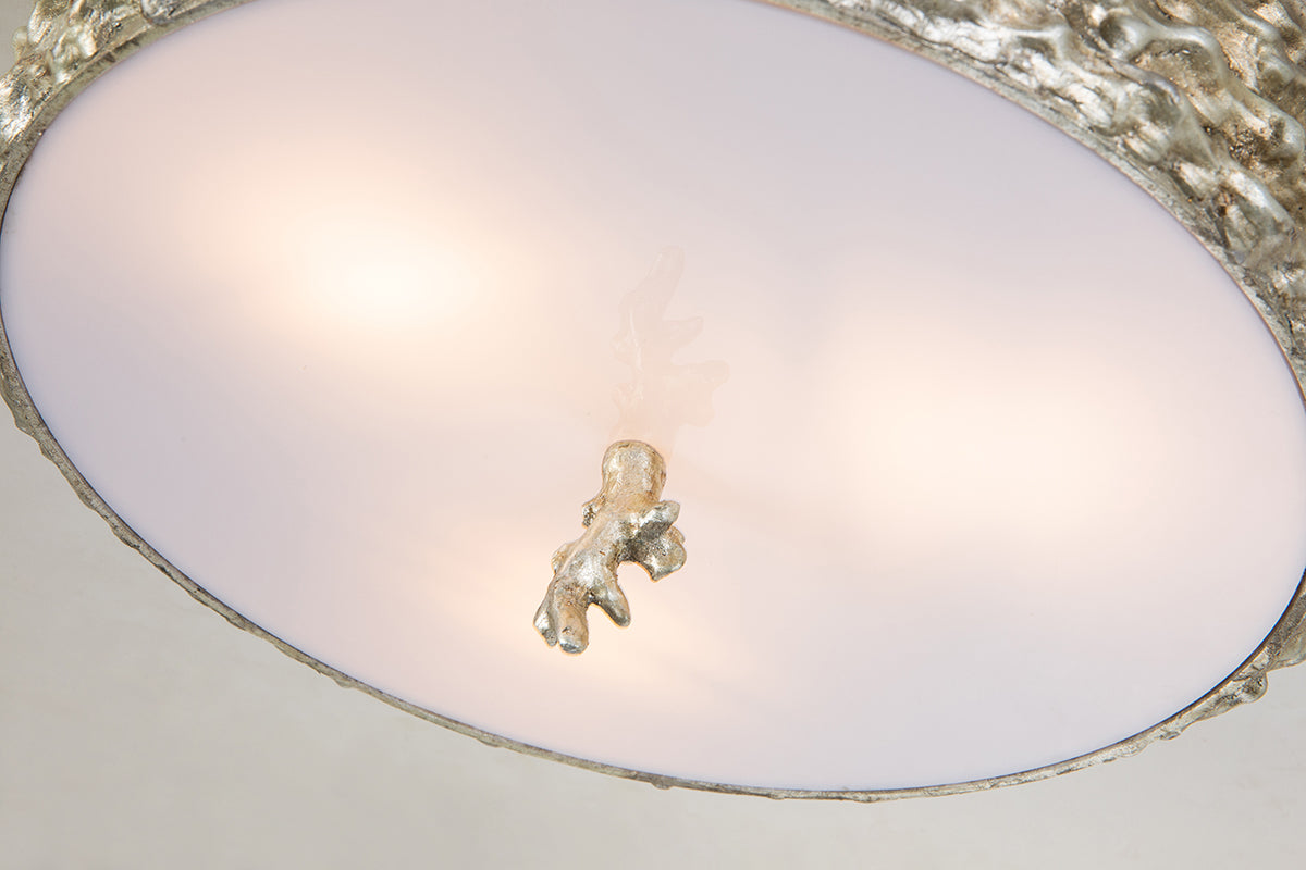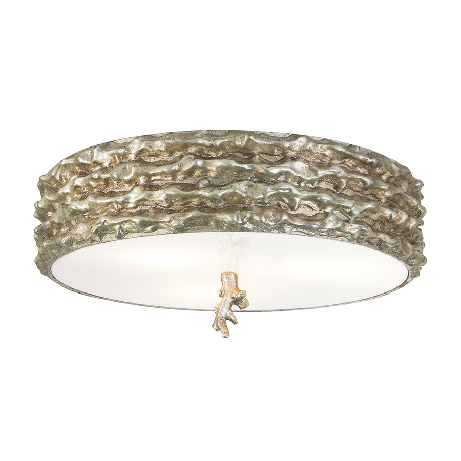 Light up any space in glamorous style with this 16 inch round antique silver flush mount. This sophisticated 3 light ceiling fixture, features a cylindrical hand painted frame that uses texture to create the decorated pattern that is used in our trellis collection. Complete with a frosted glass diffusor to spread the light evenly around the space, and a beautifully sculpted finial to add that finishing touch.
