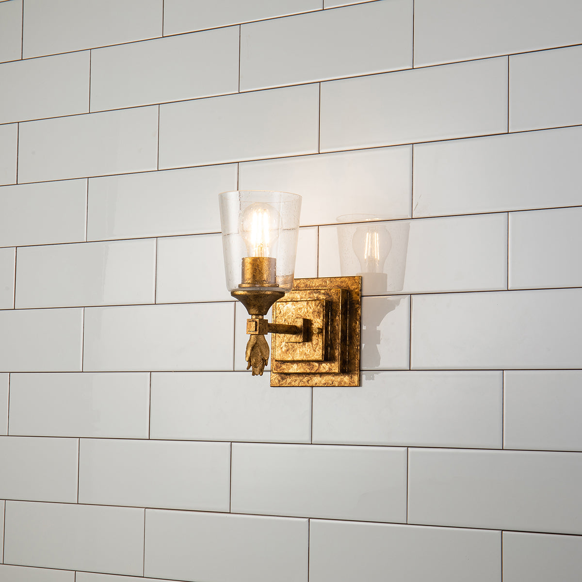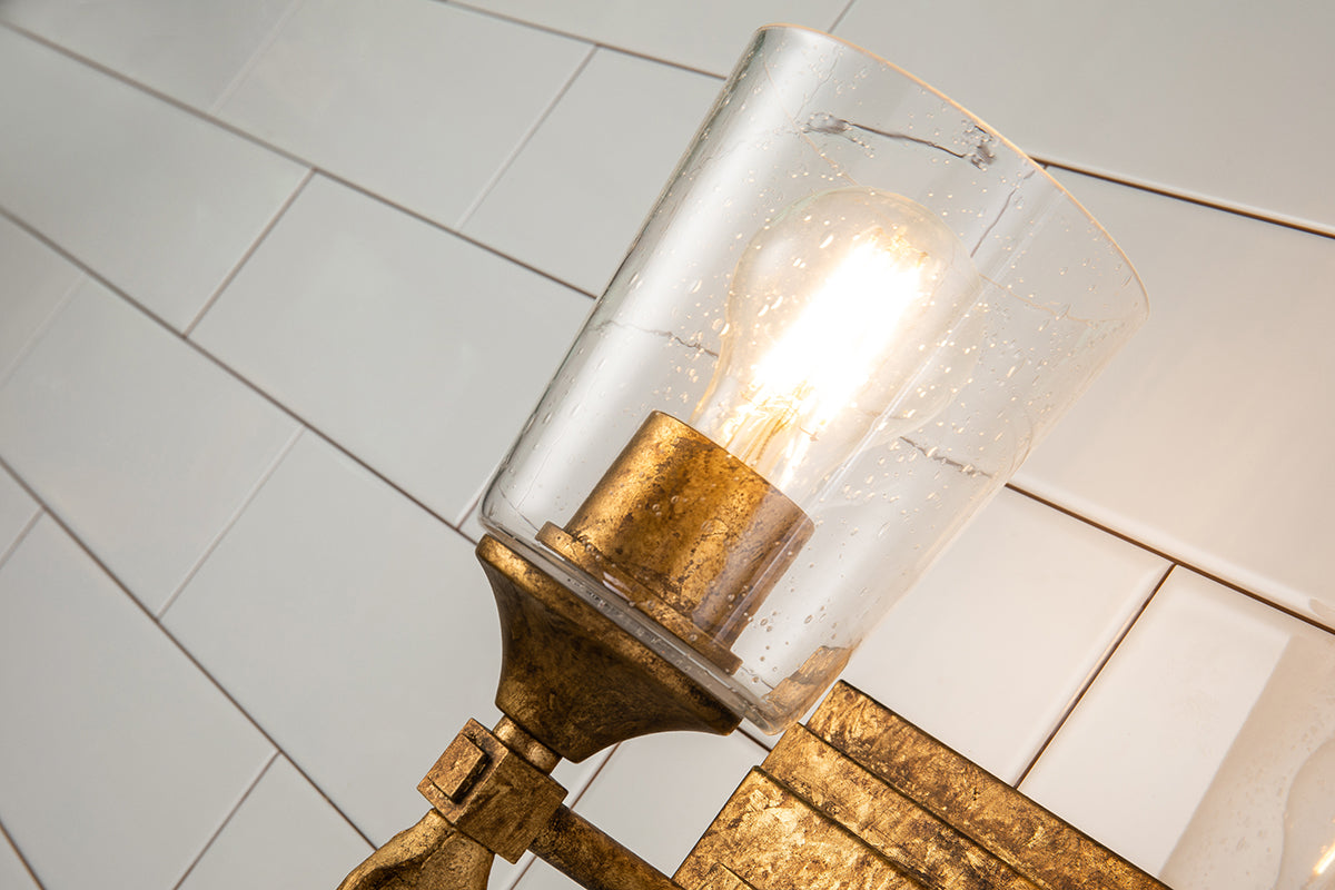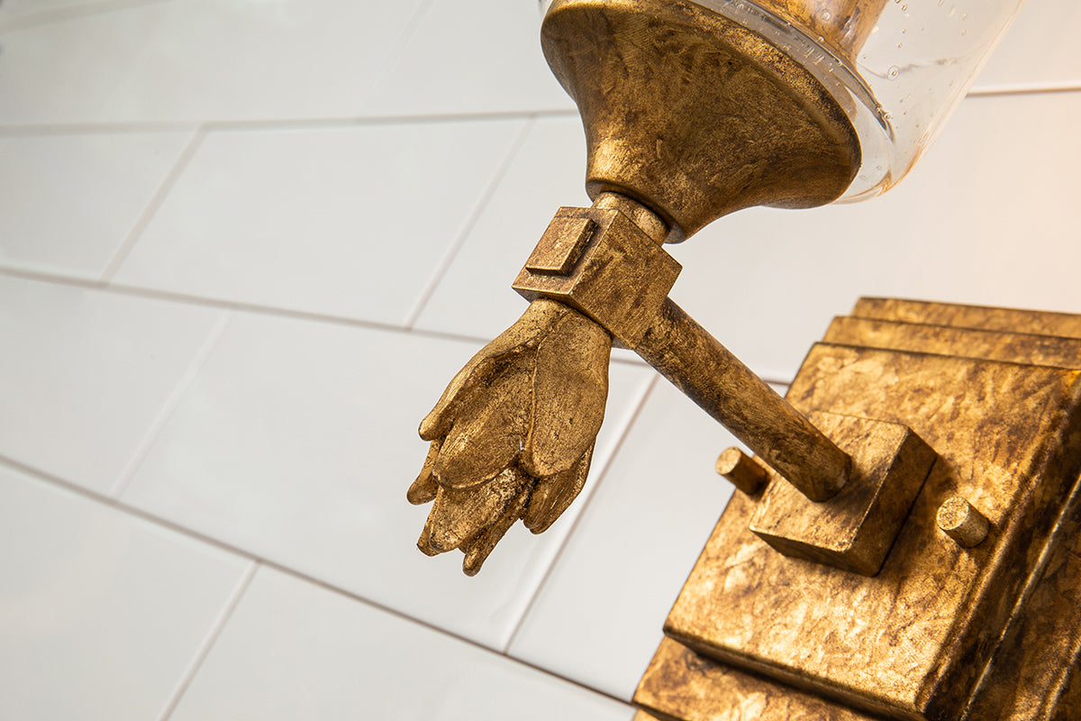 Inspired by 1950s and '60s design, the antique gold finish and double square backplate of our Vetiver wall sconce adds charming style to bedrooms, living rooms and dining spaces. Another favorite spot for this vintage-inspired 1-light wall sconce is your favorite reading nook or as a bathroom vanity light. The simple clear seeded glass and the detailed gold finial complete the look of our favorite one-light sconce.