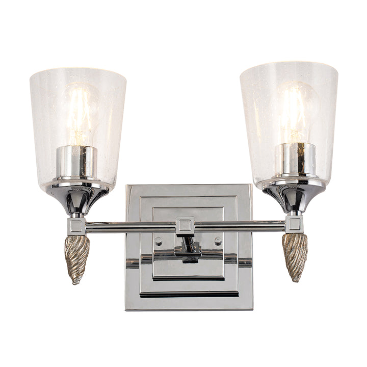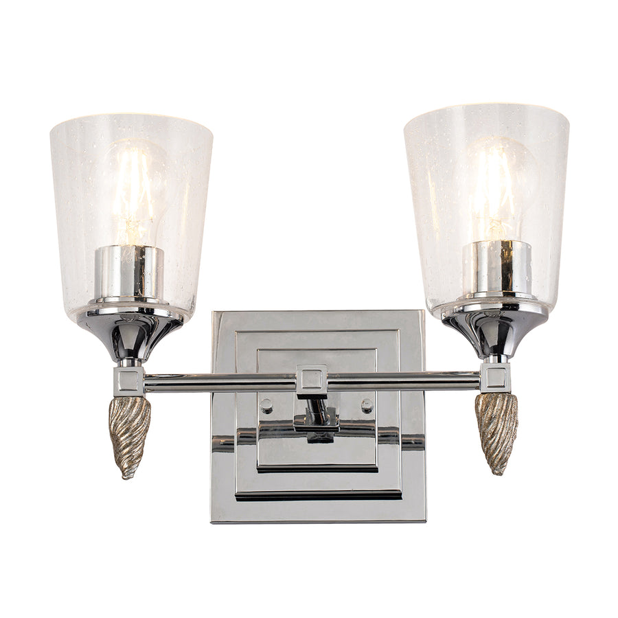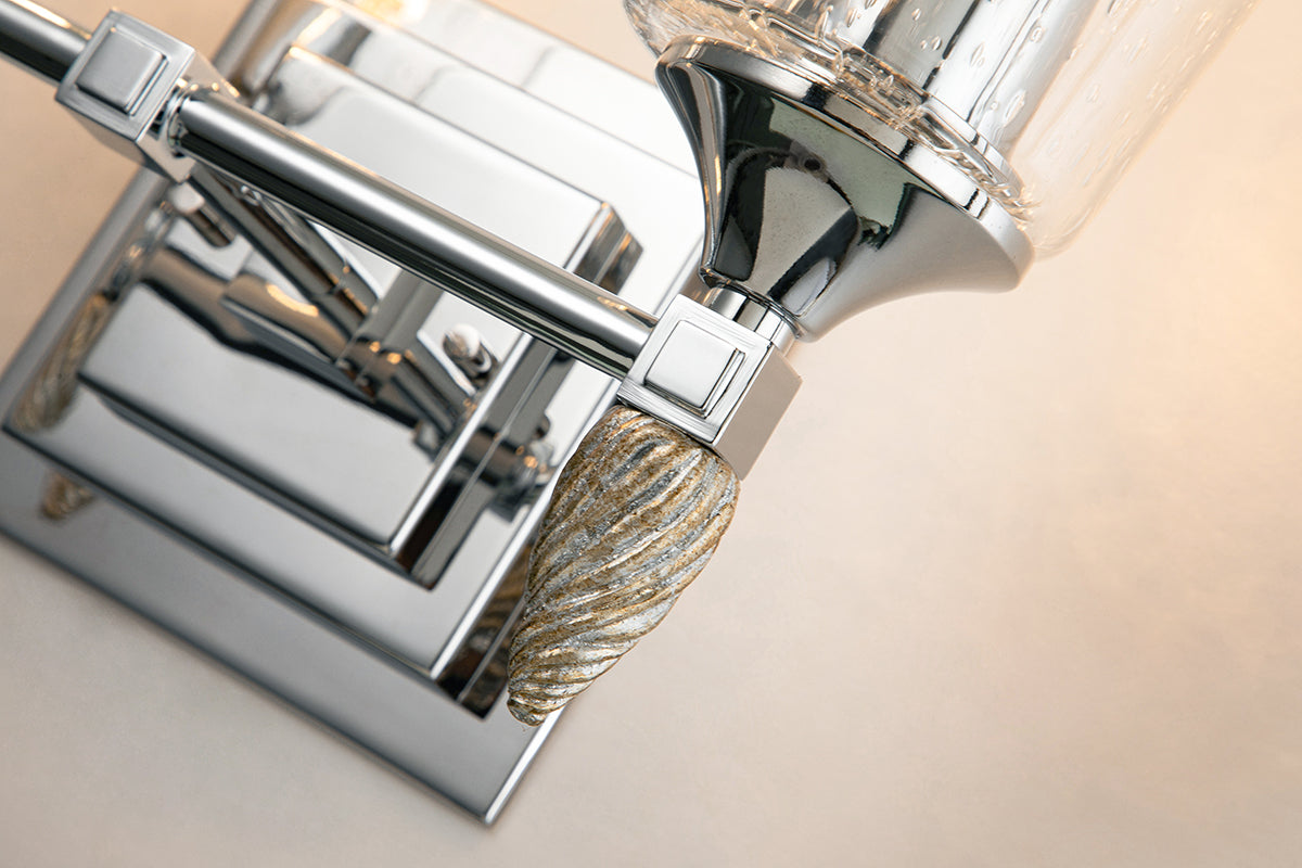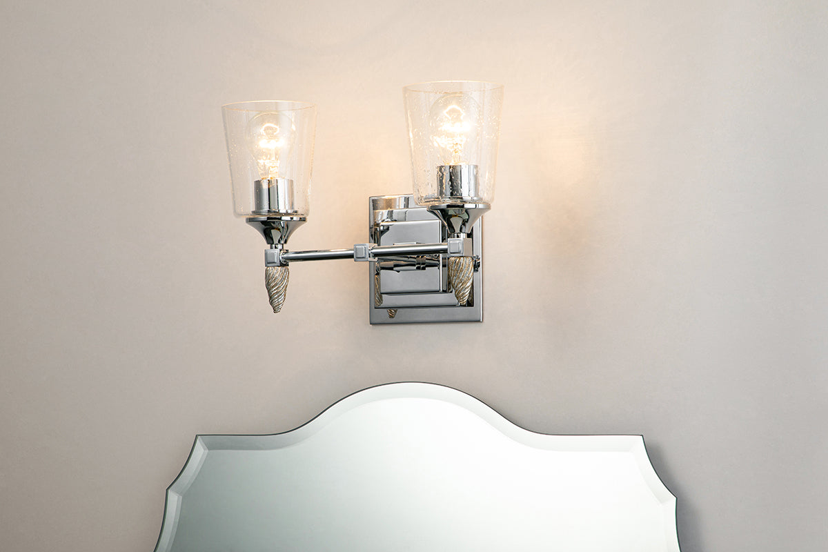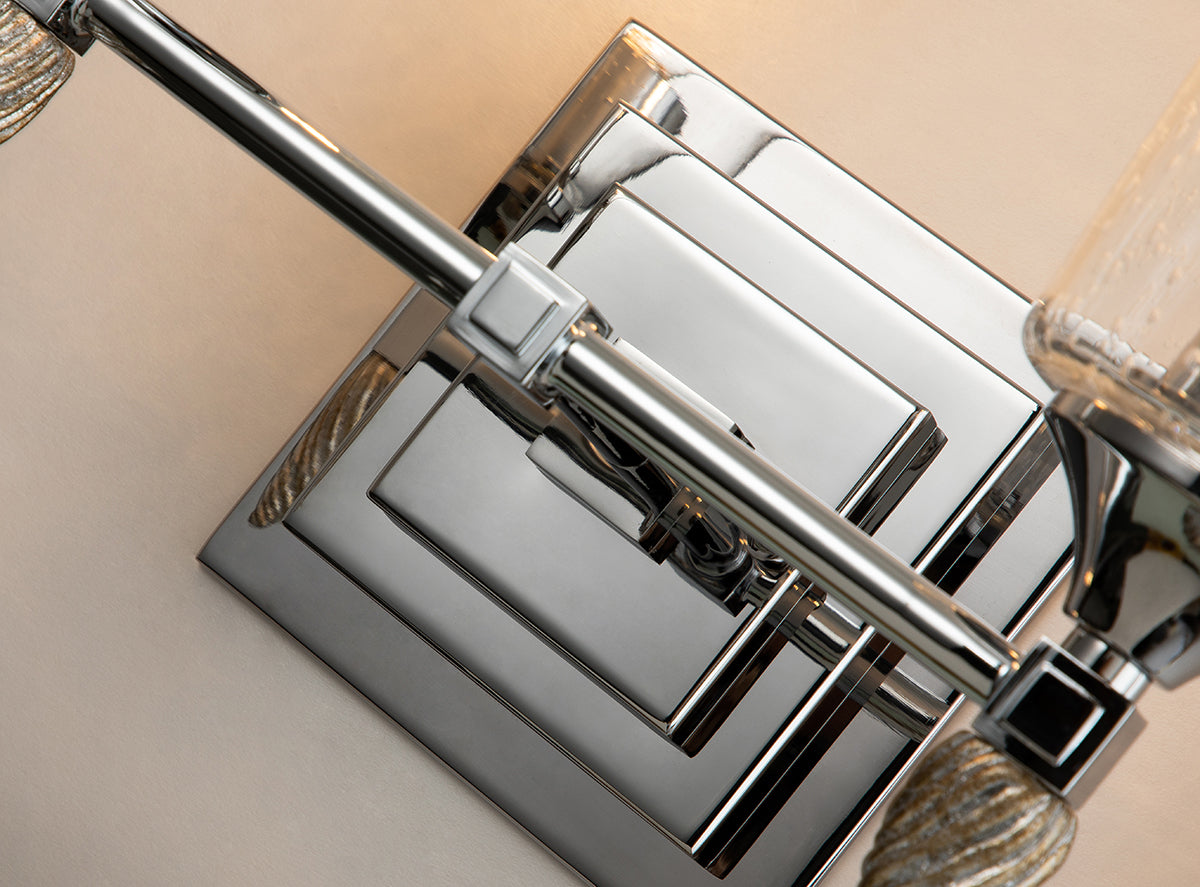 Inspired by 1950s and '60s design, the polished chrome finish and double square backplate of our Vetiver two-light wall sconce adds charming style to bathrooms, living rooms and favorite reading spots . The simple clear seeded glass and the beautifully detailed silver finial complete the look of this new 2-light vanity bath bar.