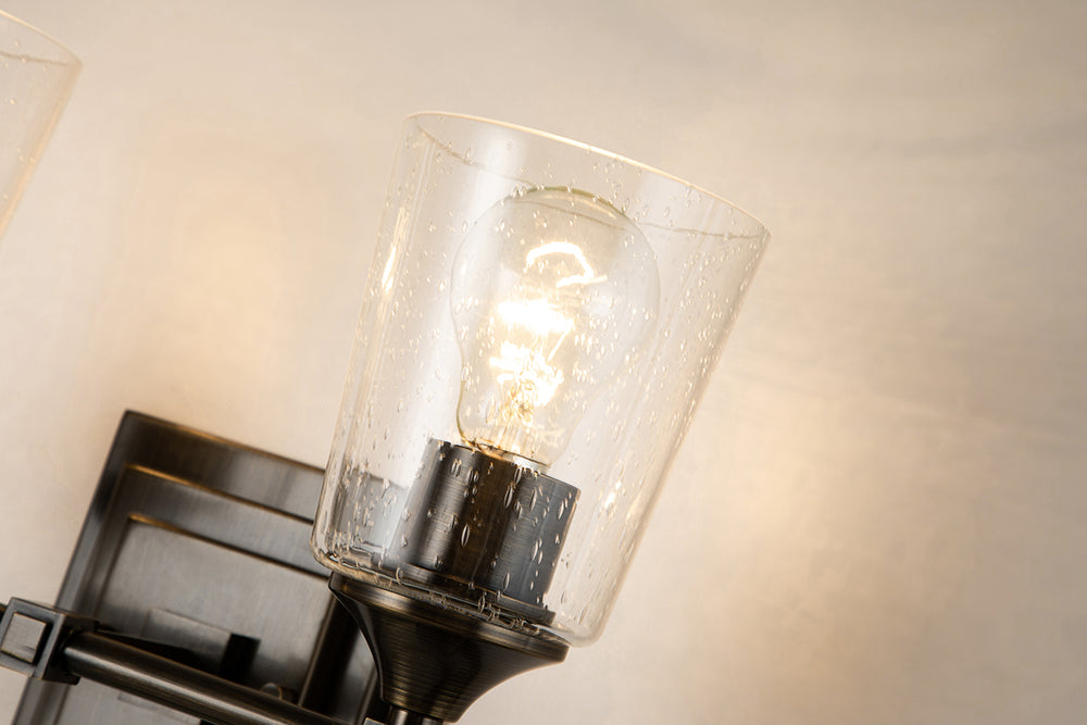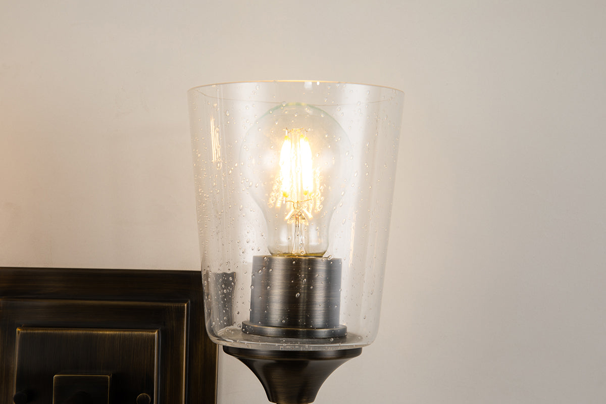 Inspired by 1950s and '60s design, the dark bronze finish and double square backplate of our Vetiver two-light wall sconce adds charming style to bathrooms, living rooms and favorite reading spots . The simple clear seeded glass and the beautifully detailed antique gold finial complete the look of this new 2-light vanity bath bar.