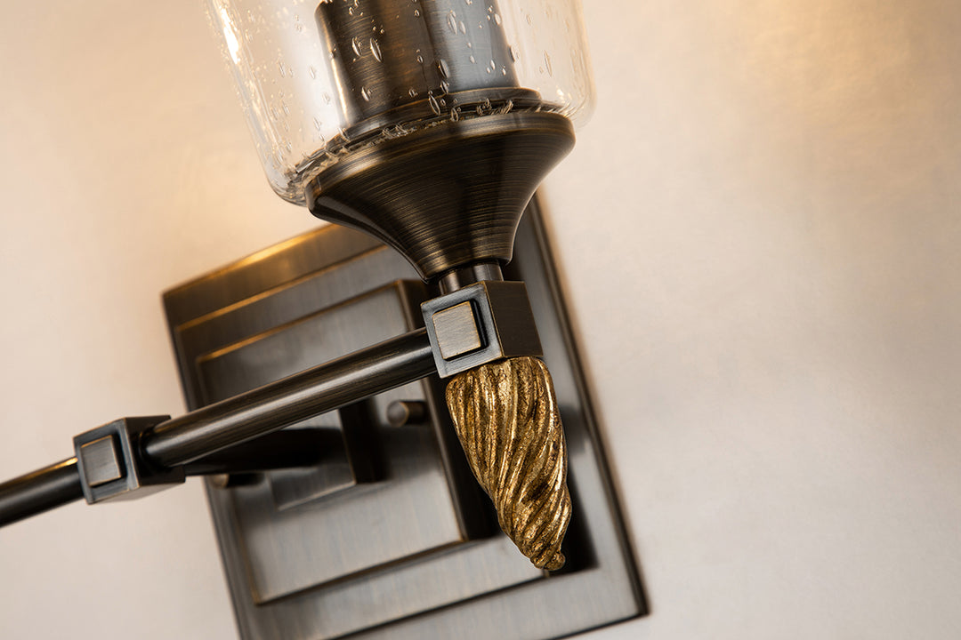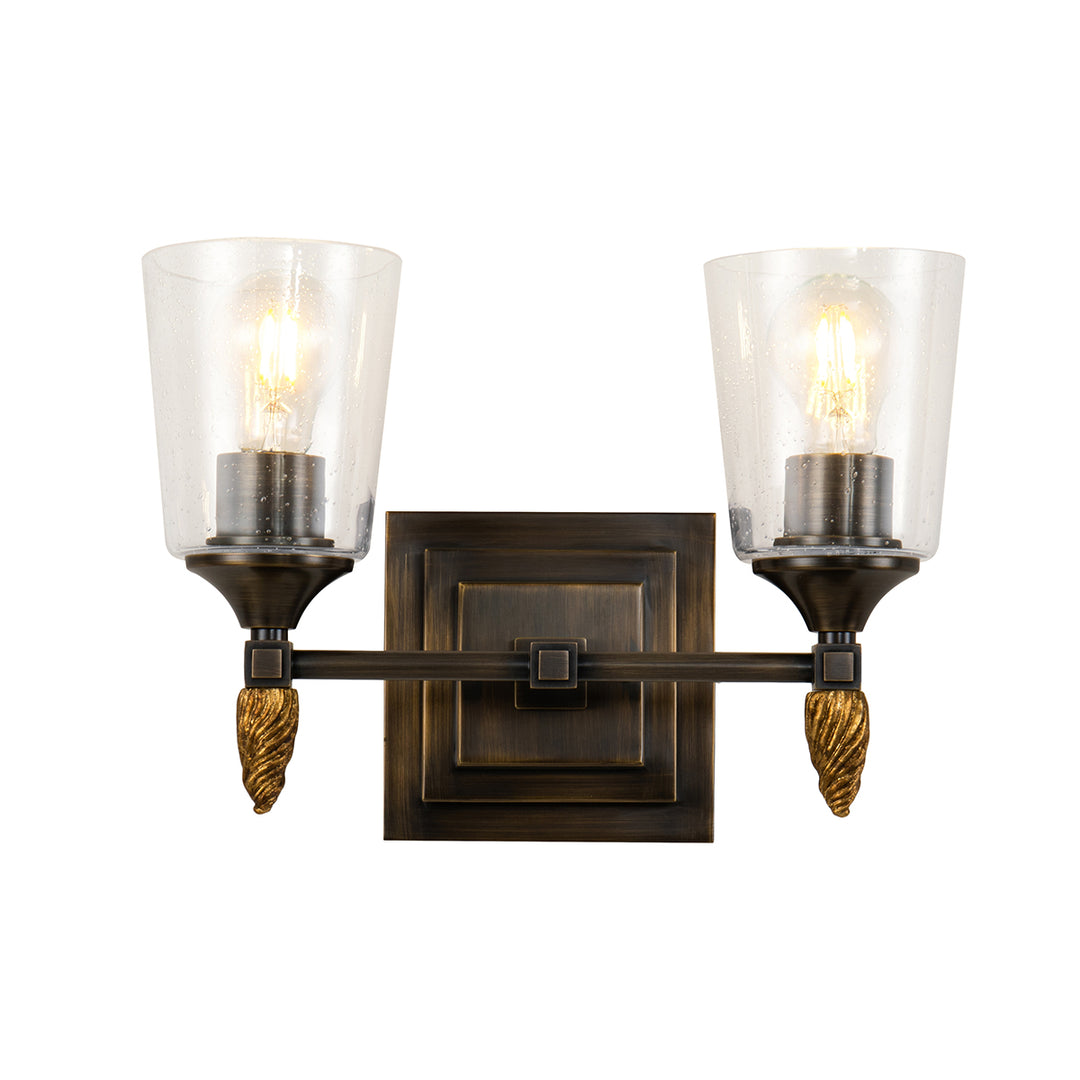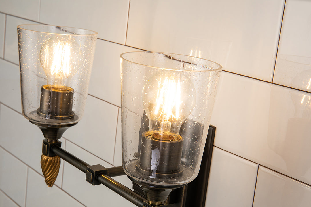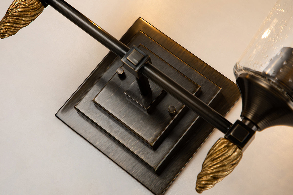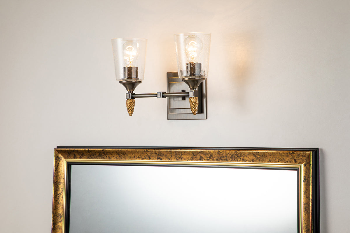 Inspired by 1950s and '60s design, the polished chrome finish and double square backplate of our Vetiver two-light wall sconce adds charming style to bathrooms, living rooms and favorite reading spots . The simple clear seeded glass and the beautifully detailed antique gold finial complete the look of this new 2-light vanity bath bar.