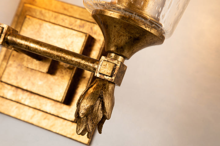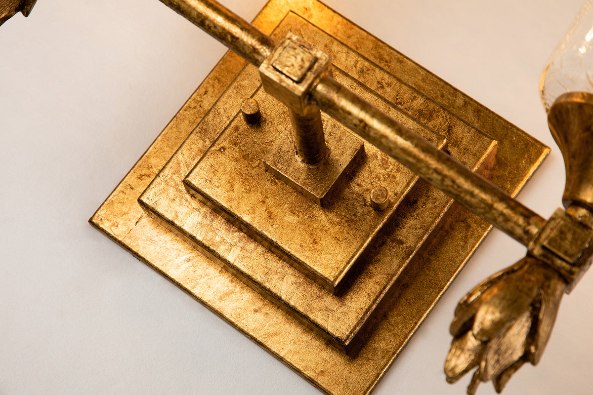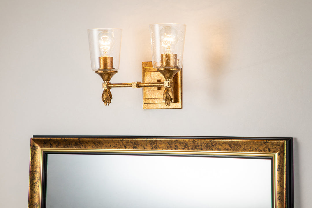 Inspired by 1950s and '60s design, the antique gold finish and double square backplate of our Vetiver two-light wall sconce adds charming style to bathrooms, living rooms and favorite reading spots . The simple clear seeded glass and the detailed gold finial complete the look of this new 2-light vanity bath bar.