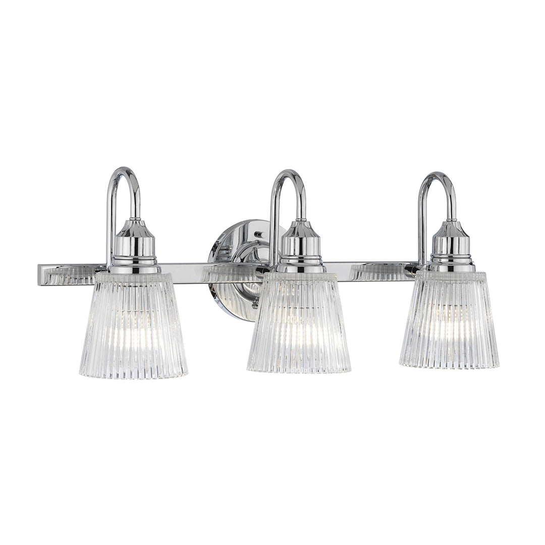 Classic styled 3 light bath light with clear ribbed glass and polished chrome finish. Can be hung up or downwards