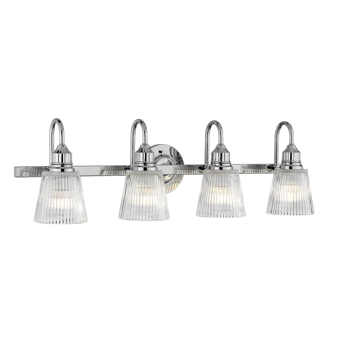 Classic styled 4 light bath light with clear ribbed glass and polished chrome finish. Can be hung up or downwards