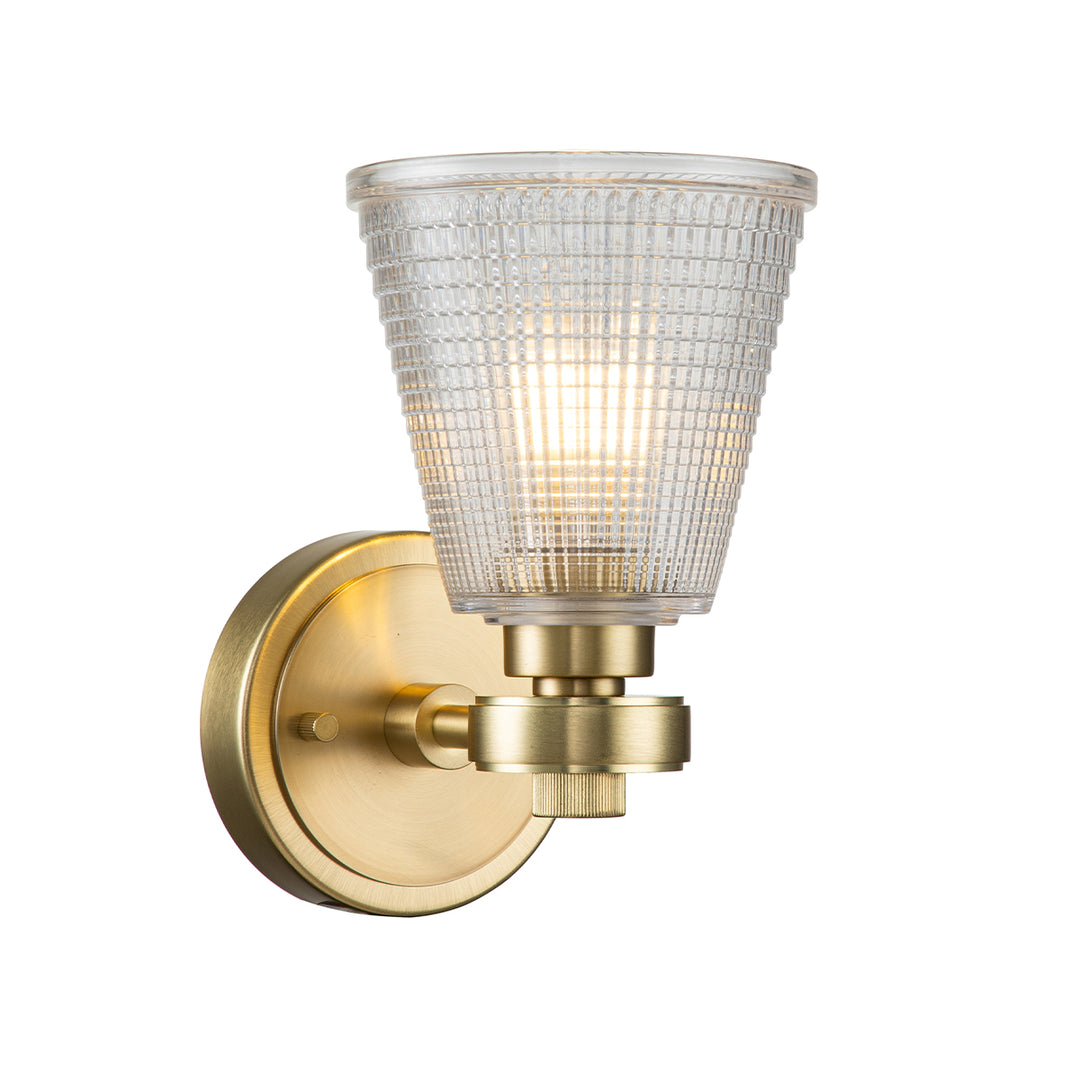 Gunnis1 1 Light Bath Light in Brushed Brass with prismatic glass shade. Can be duo mounted. Also has extended finial option.