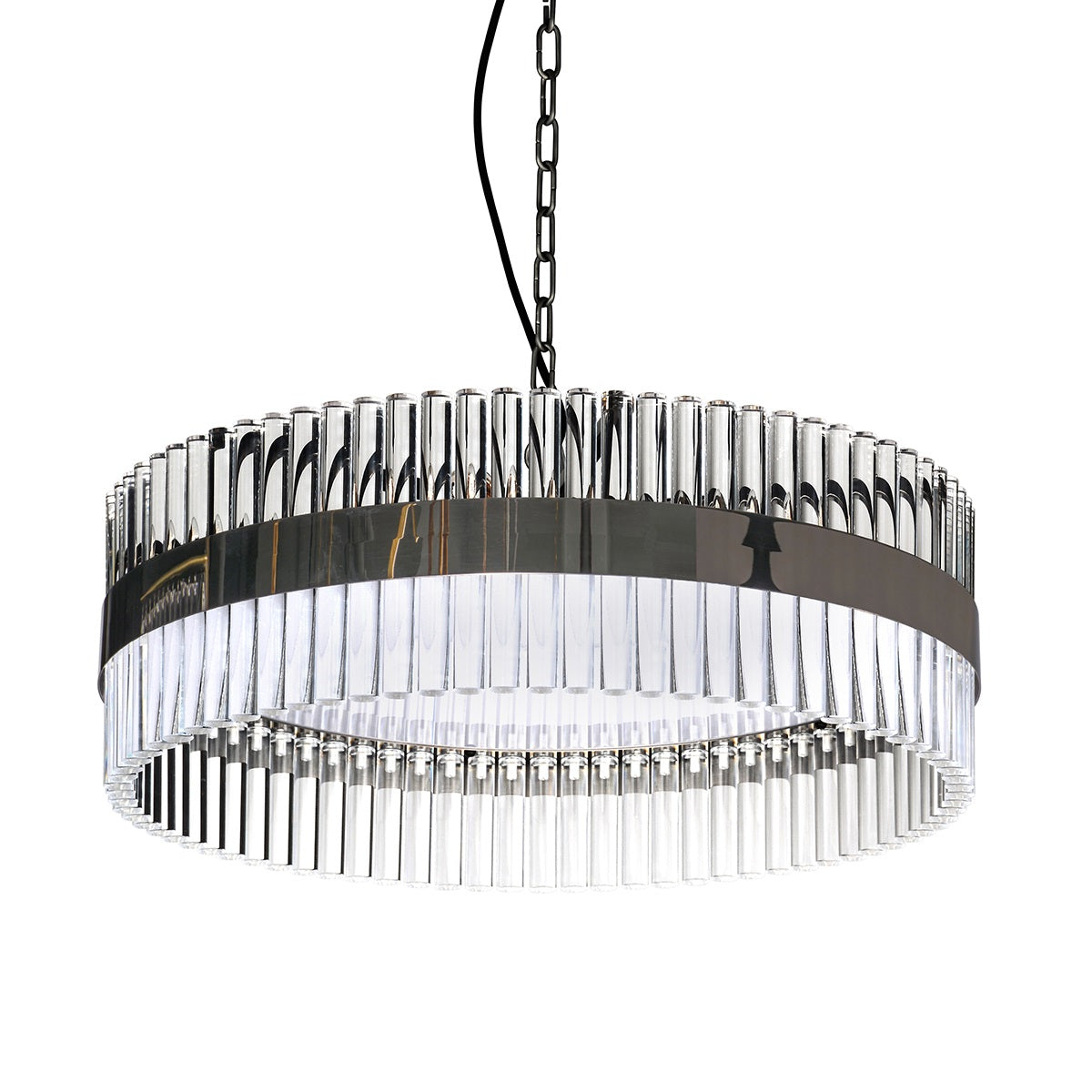 Great pendant lighting can transform a foyer, dining room or living area with a quick flip of the switch. Our large 24" diameter Metro pendant features contemporary lines of clear glass-like tubes made from acrylic arranged into drum-shaped rows. Wrapped with a Dark Chrome band, and finished with Smokey Chrome accents, the large Metro pendant takes 9 candelabra based bulbs. A white diffuser creates an even light spread ideal for illumination above a kitchen island or dining space. Charming and simple, this pendant's design story is being told with texture and beautiful finishes.