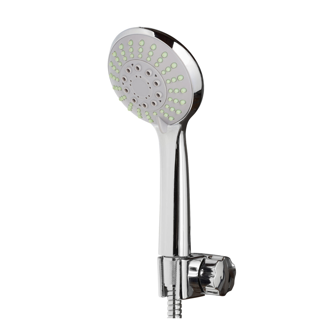 - 5-function handshower with double-interlocking stainless steel hose that stretches from 59-in to 78-in