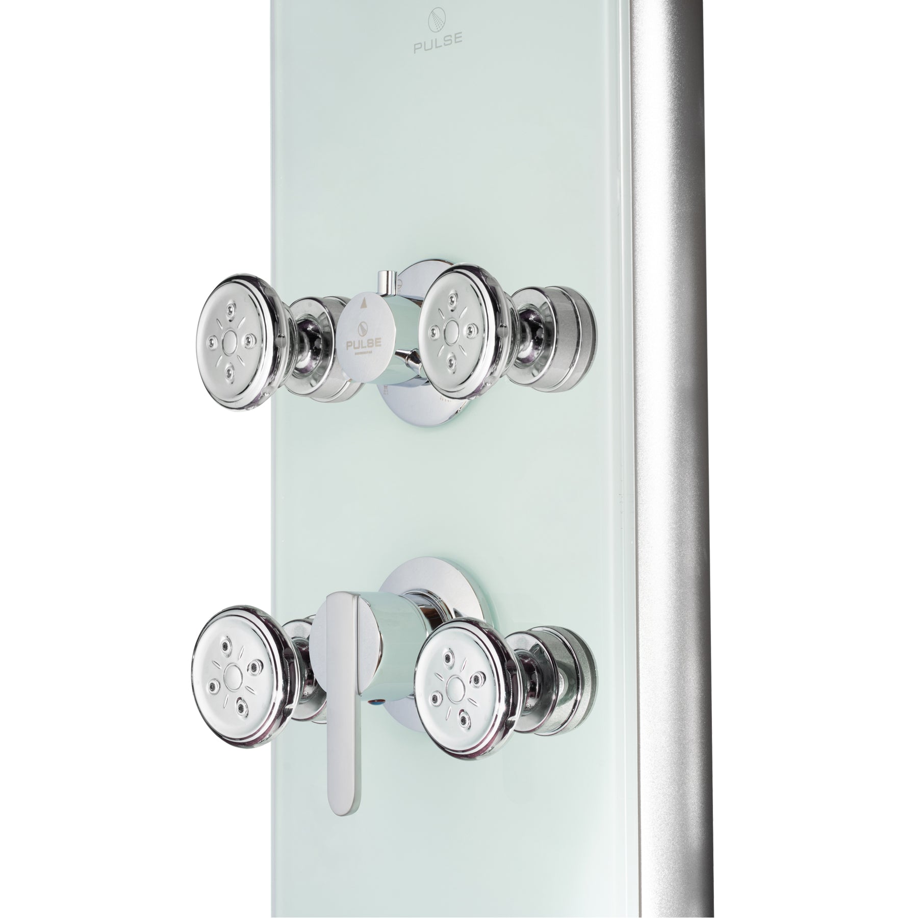 - Seafoam tempered glass panel with anodized aluminum frame and chrome accents