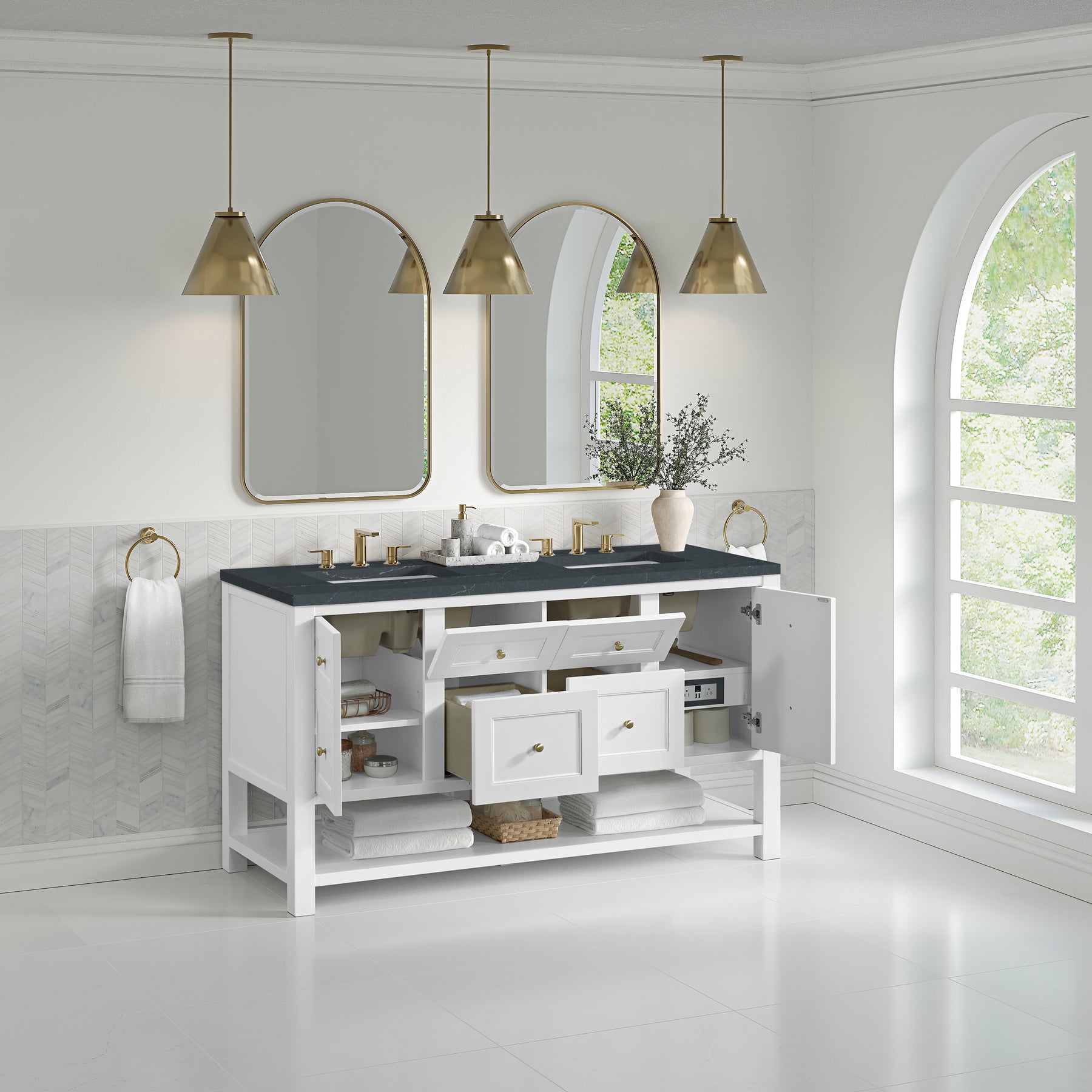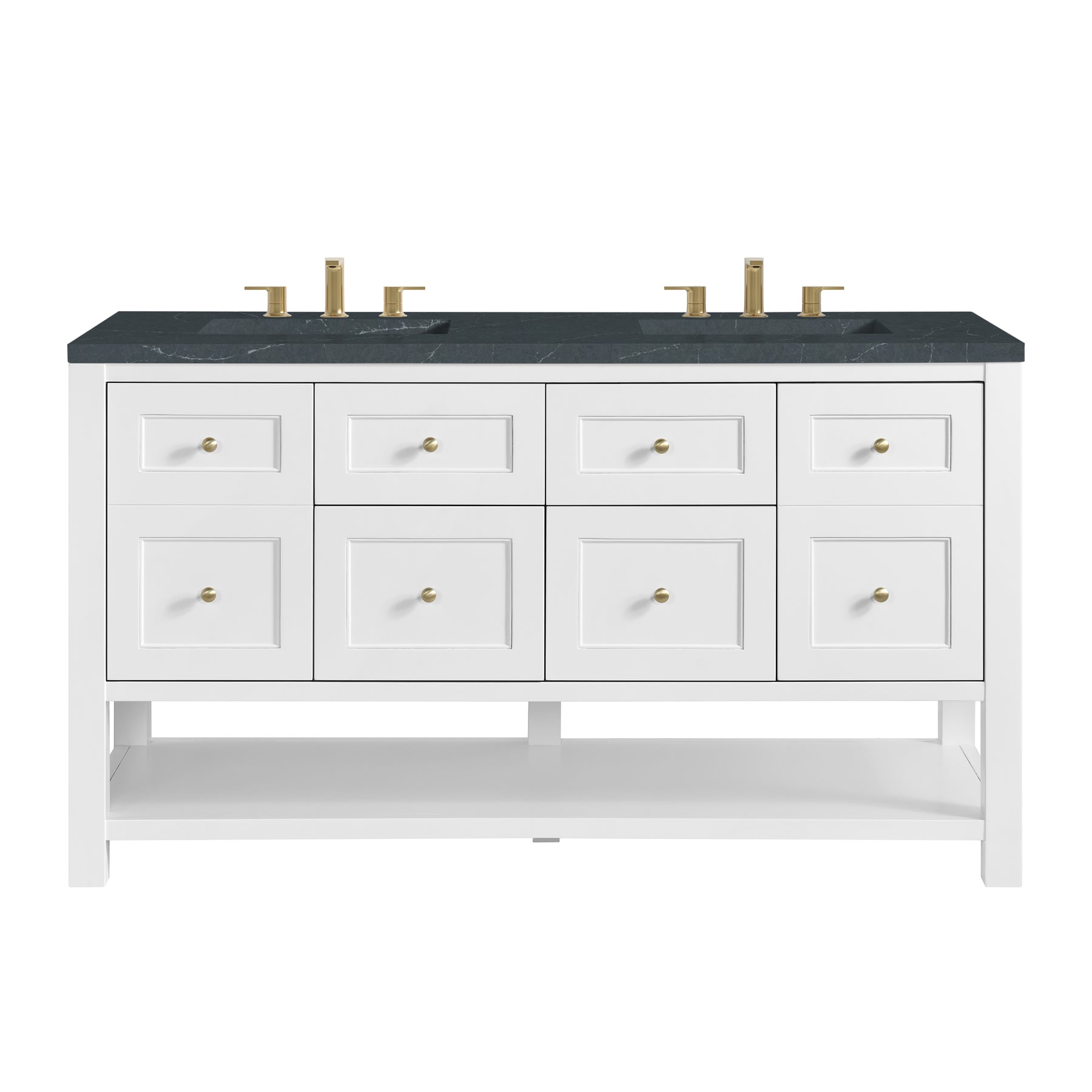 The Breckenridge 60" Double Vanity is a fresh take on traditional Mission furniture that easily transitions to Modern Farmhouse style with an air of understated sophistication. Champagne Brass knobs complement the Bright White finish, while the neatly inset door and drawer fronts lend a fresh appeal to this clean-lined classic. Two single-door cabinets open to reveal interior shelves equipped with a convenient built-in USB/120V power outlet. This console-style vanity also features two top-row tip-out drawers, two standard full-extension drawers, and an open lower shelf for additional storage. A suede-finished Charcoal Soapstone Silestone top with undermount sinks completes the look.