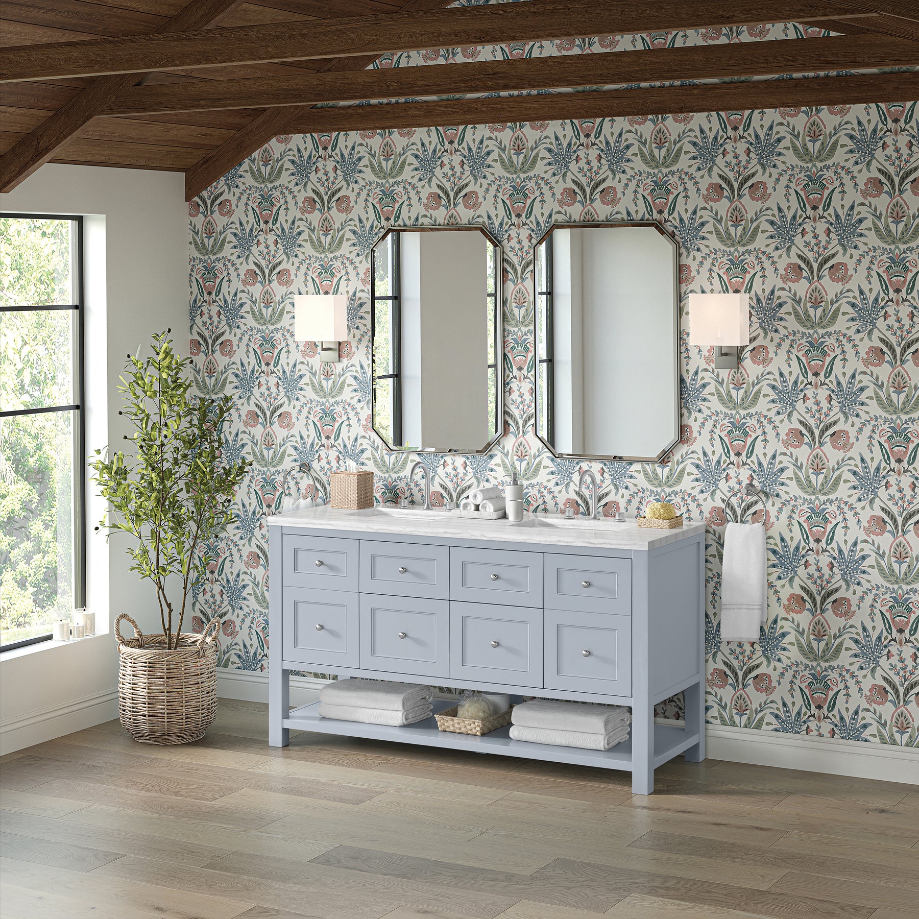 The Breckenridge 60" Double Vanity is a fresh take on traditional Mission furniture that easily transitions to Modern Farmhouse style with an air of understated sophistication. Satin Nickel knobs complement the Serenity Blue finish, while the neatly inset door and drawer fronts lend a fresh appeal to this clean-lined classic. Two single-door cabinets open to reveal interior shelves equipped with a convenient built-in USB/120V power outlet. This console-style vanity also features two top-row tip-out drawers, two standard full-extension drawers, and an open lower shelf for additional storage. A modern Arctic Fall Solid Surface top with undermount sinks completes the look.
