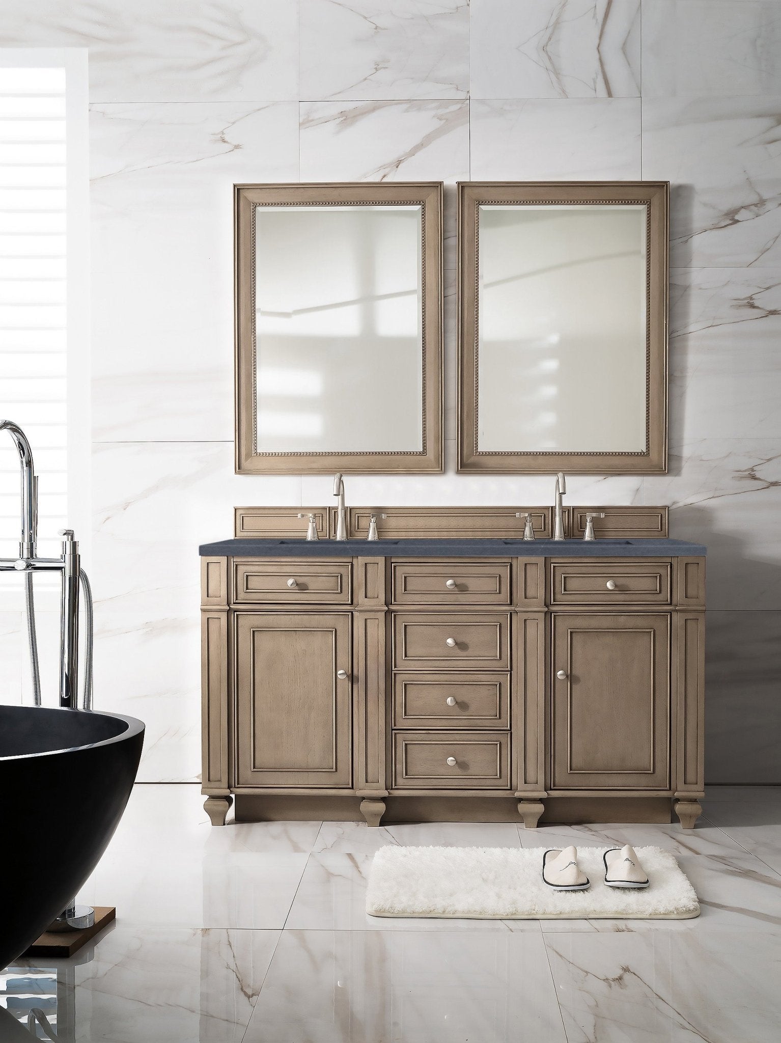 The Bristol 60" Whitewashed Walnut Double Vanity features a full plinth base, also known as a toe kick or pedestal base. This wraparound base allows for quick clean ups. This vanity is complimented by Satin Nickel door and drawer pulls, along with an optional wood backsplash. The look is completed with a 3 CM eased edge Charcoal Soapstone Silestone top and one white ceramic rectangular sink.