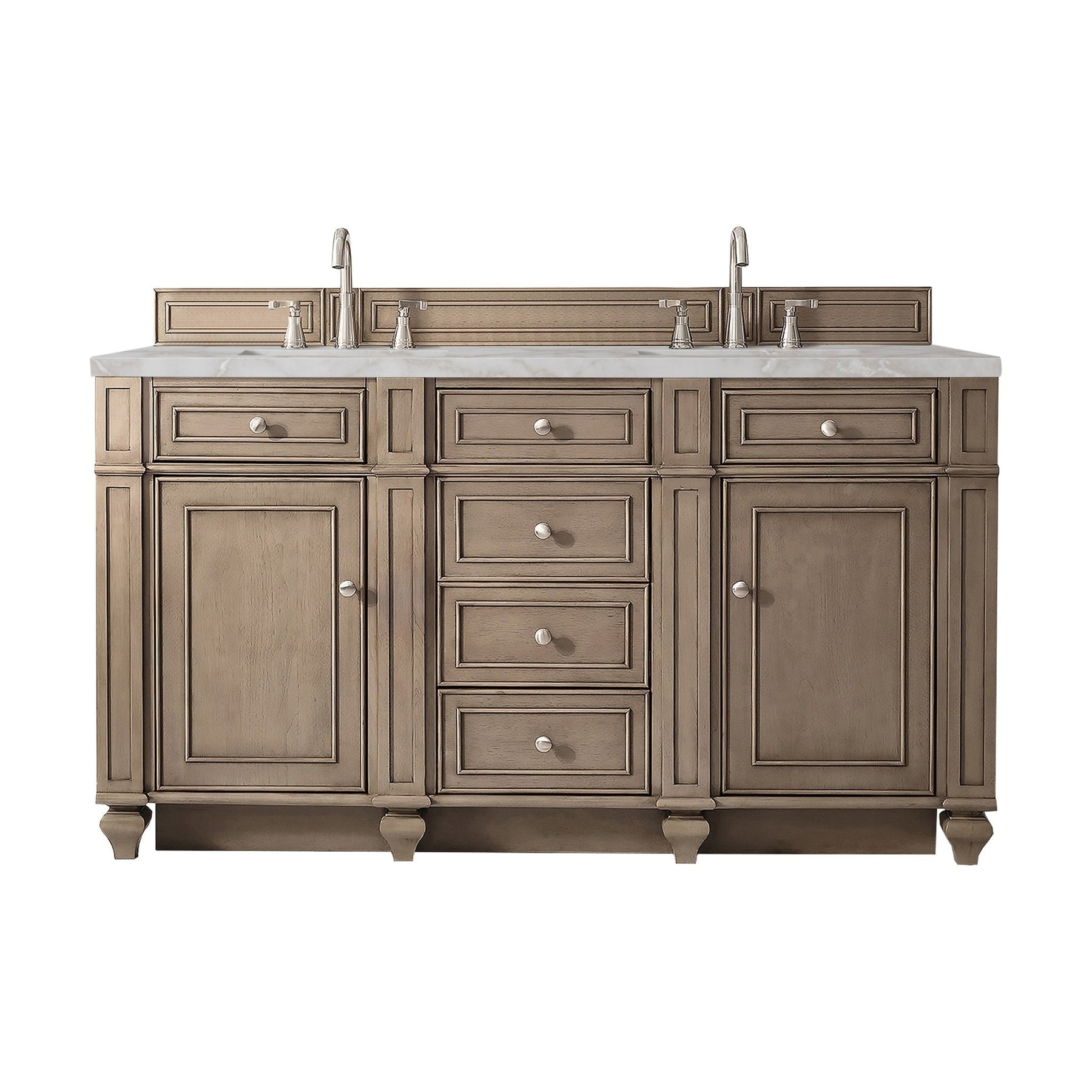 The Bristol 60" Whitewashed Walnut Double Vanity by James Martin Vanities is a perfect blend of elegance and practicality for your bathroom. This detailed and distinctive vanity is designed with ample storage, featuring two top-row tip-out drawers, three full-extension aluminum laminate-lined drawers, and two doors that open to reveal an internal shelf. Satin Nickel door and drawer pulls add a touch of modern elegance, while the tulip legs optional wood backsplash provides an additional decorative element. The cabinet is topped with a 3 CM Silestone® Victorian Silver countertop, with white porcelain undermount rectangular sinks.